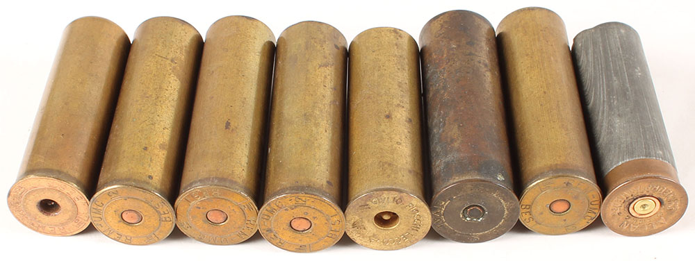 Lot of 8 Brass NPE shot shells. Grade: Good + - Value: 6 to 30
