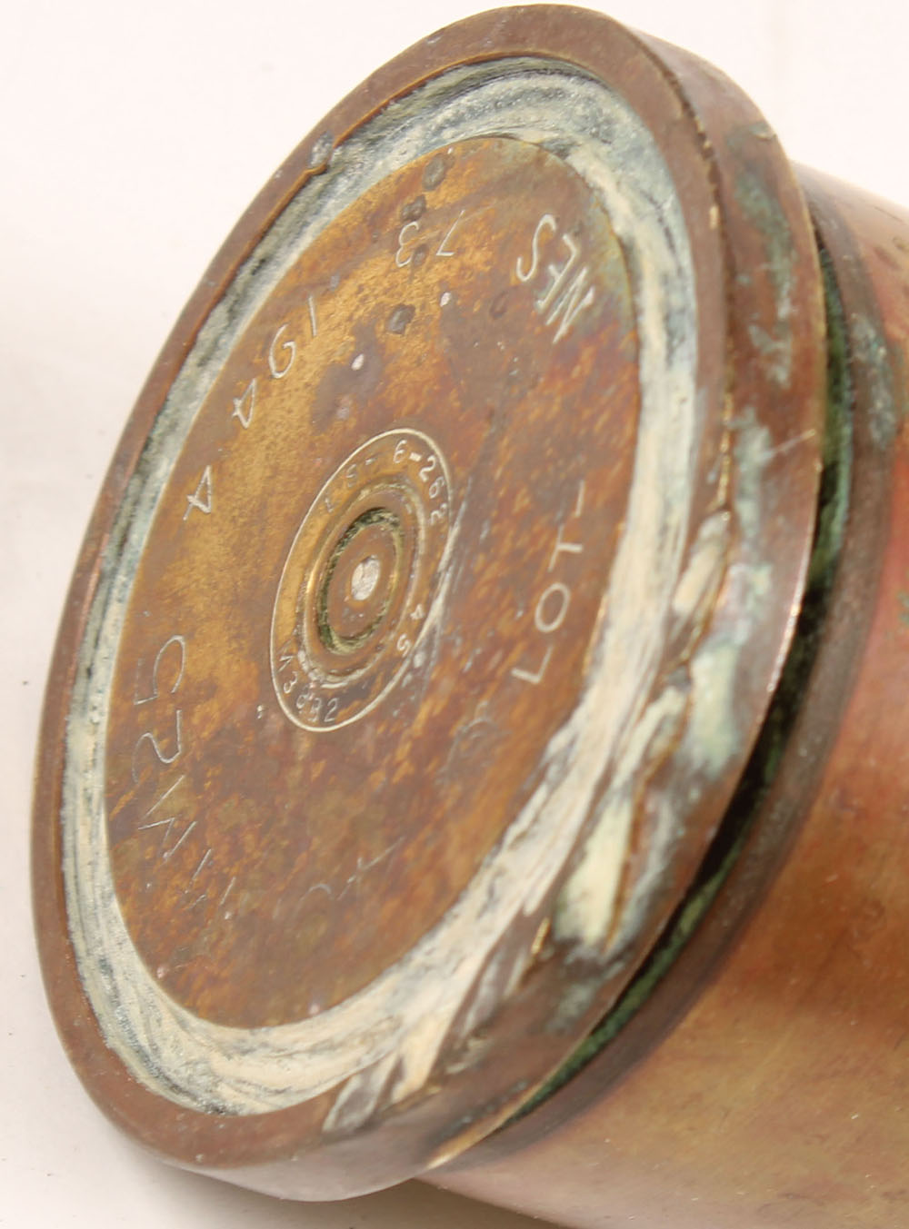 US, 40mm case for Bofors 40mm L/60 Anit-Aircraft gun. H/S: 40MM M25'', ''LOT-NES 73 1944''. OAL 12 1/8''. Grade: Very Good + - Value: 10 to 50