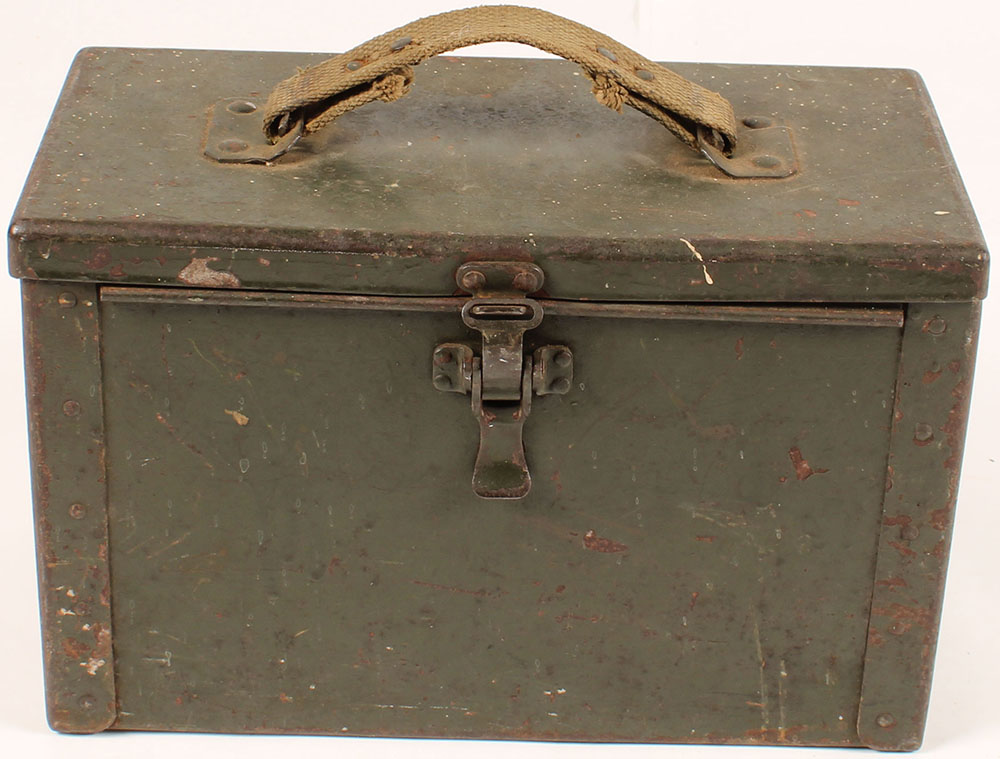 Metal ammo can, empty, Inside has light rust, inside measures 12'' x 5 5/8'' x 7 1/4''. Grade: Good ++ - Value: 6 to 20