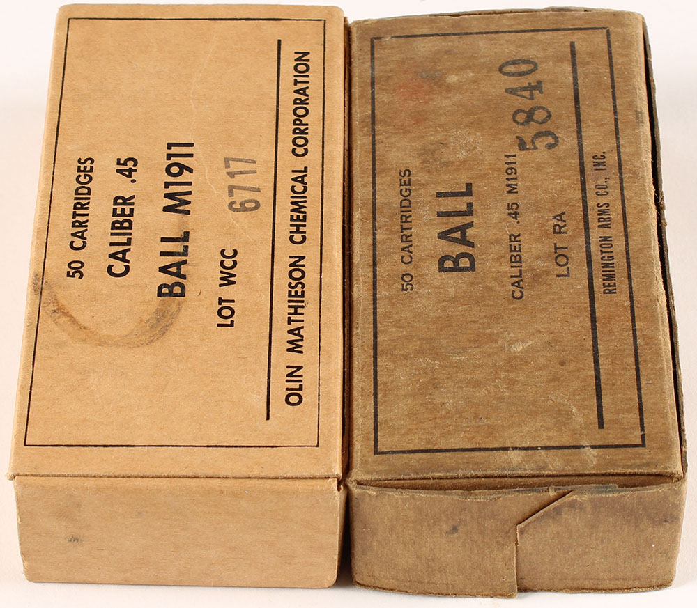 Mixed Mfg., Lot of (2), Ball M1911, .45 Auto. Western box is Full, Remington box is partial 42rds., 1pc. Buff boxes with black printing, boxes are solid with very good to excellent color, some age soiling, corners are mostly sharp, edges are mostly crisp, top flaps are solid, ammo is excellent. Grade: Very Good ++ - Value: 24 to 36