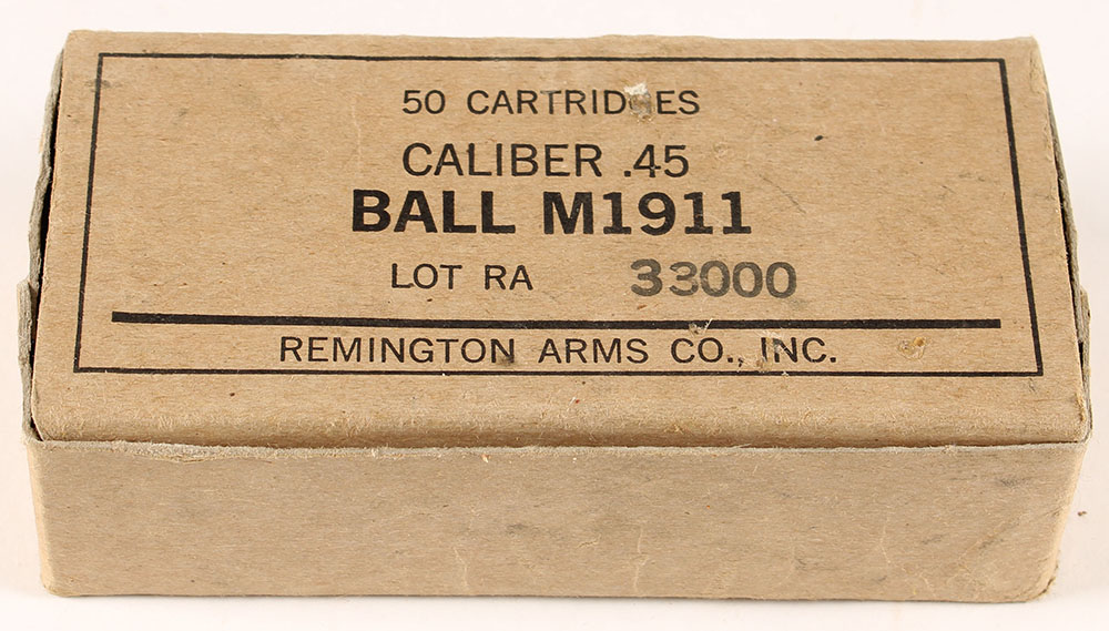 Remington, Ball M1911, .45 Auto., Lot RA 33000, Full of mixed H/S, 1pc. Buff box with black printing, box is solid with excellent color, minor edge & corner wear, top flap is solid, ammo is excellent. Grade: Excellent - Value: 12 to 18