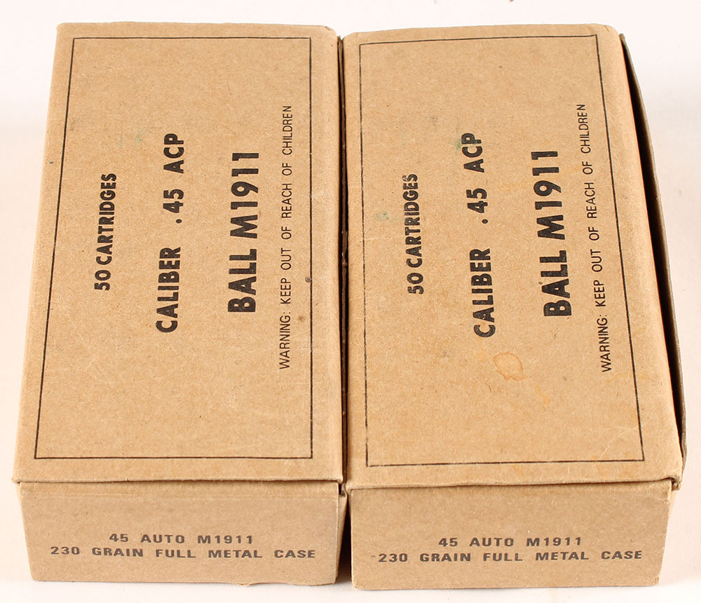 HHC Ltd., Lot of (2), Ball M1911, .45 ACP, Full, 1pc. Buff boxes with black printing, boxes are solid with excellent color, very minor edge wear, corners are mostly sharp, top flaps are solid, ammo is excellent. Grade: Excellent + - Value: 24 to 36