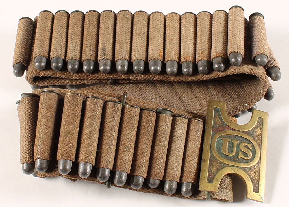 US, indian wars, .45-70 cartridge Bandolier/belt, 50 loops for cartrisged, coems with 46 Rds. Of commecial .45-70, has a 1882 US brass buckle, buckle has patina & corrosion, bandolier has stains & small tears, faint name writen on back of bandolier, ammo is fair. Grade: Very Good + - Value: 100 to 300