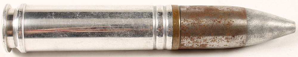 Unmarked, 30mm military cartridge, no primer, powder, or H/S, nickeled case. Grade: Very Good - Value: 2 to 20