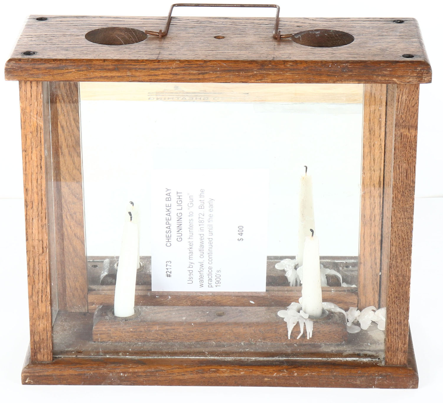 1860's Chesapeake Bay Gunning Light, used by Market Hunters to hunt waterfowl, outlawed in 1872 but the pracitce continued until the early 1900's, the mirrored back is hinged to open, has two candles for light & has two large holes at teh top for heat, made of oak & glass, 14'' x 12'' x 6'', has wire handle at top. Grade: Excellent - Value: 400 to 800