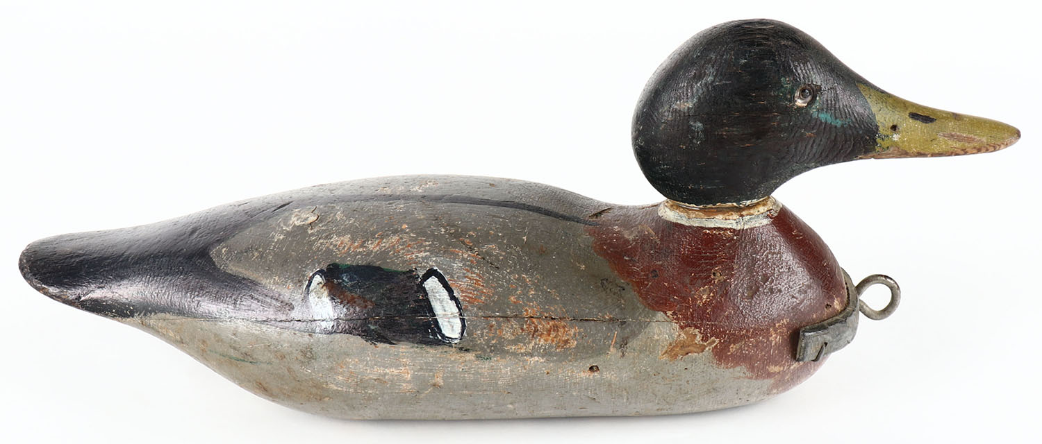 Standard Mallard Drake by Mason Decoy Company, Detroit, MI, 1896-1924. Glass eyes one missing, solid wood, old repaint, structurally excellent, has added lead & line tie to front. Grade: Very Good - Value: 40 to 80