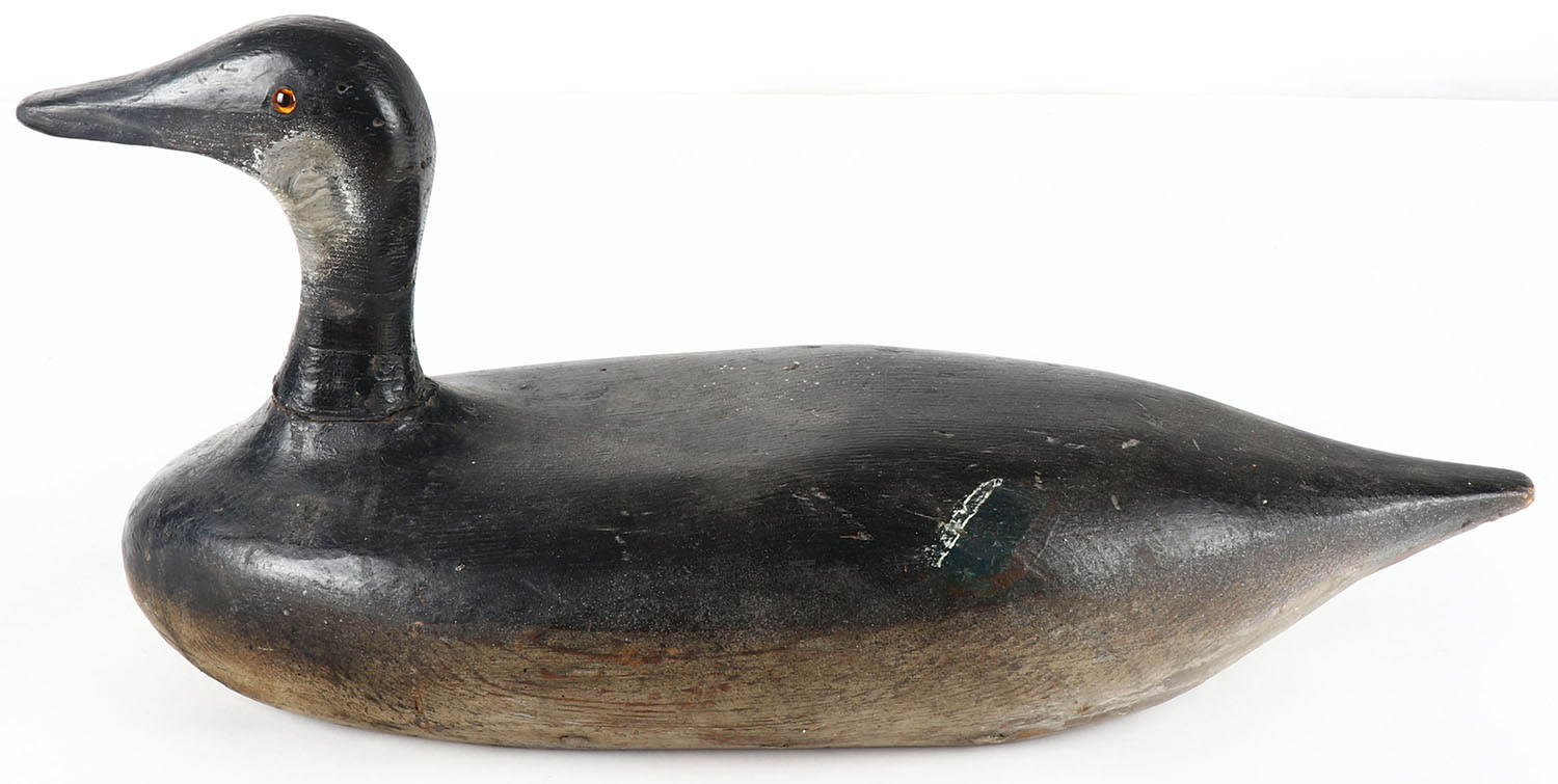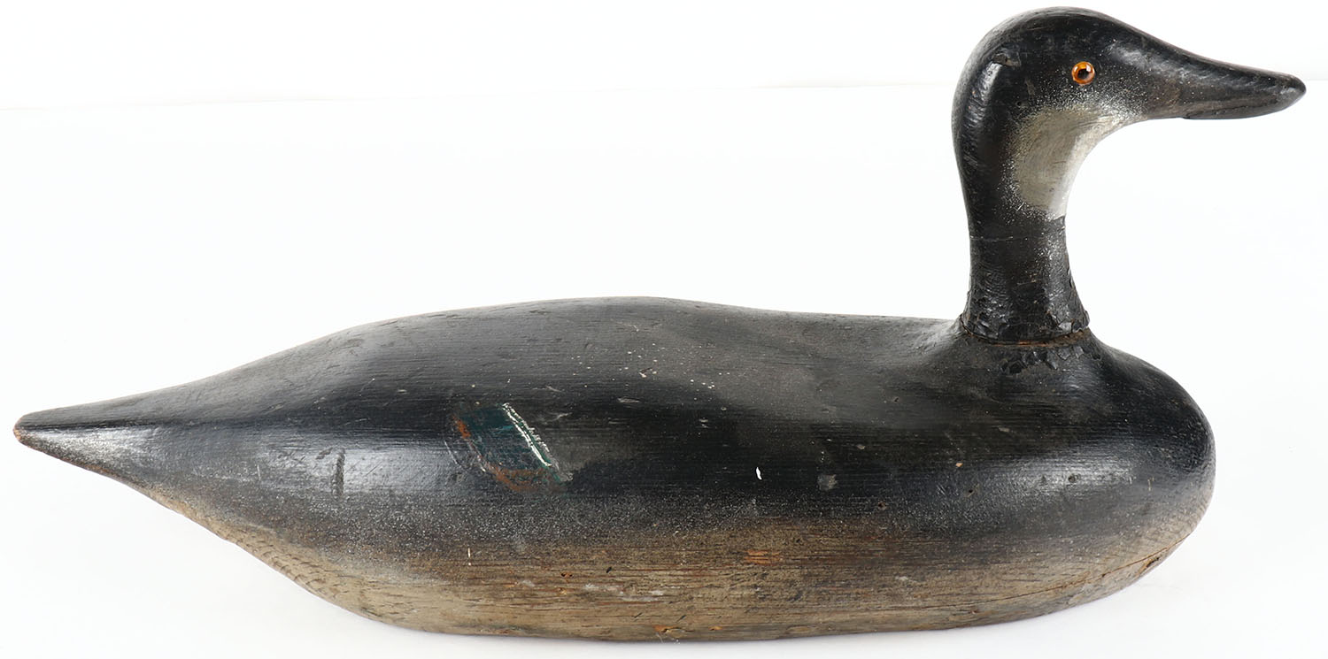 Pintail Drake with old repaint as a Brant, by Frank Hite, Aberdeen, WA, c1923, GE, hollow wood, repaint, has crack to neck & missing neck filler, 20'' OAL. Grade: Very Good + - Value: 50 to 150