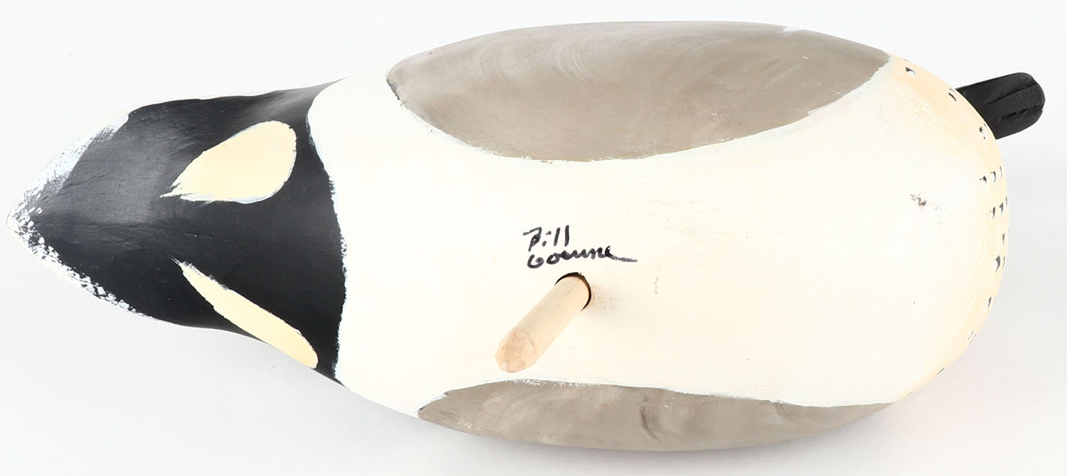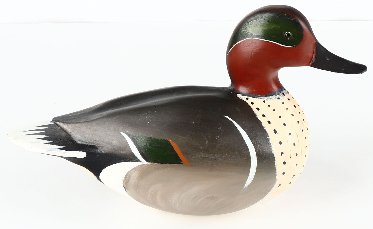 Green Wing Teal Drake by Bill William Goenne, King City, CA, glass eyes, solid wood on stake no stand, original paint, structurally excellent, 13 1/2'' OAL. Grade: Excellent ++ - Value: 100 to 200