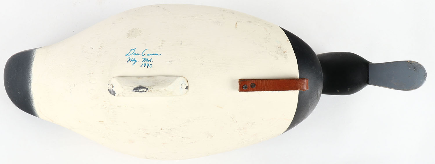 Swimming Bluebill Drake by Dan Carson, Haver de Grace, MD, c1990, PE, solid wood, original paint, structurally excellent, signed on bottom, 16 1/2'' OAL. Grade: Excellent - Value: 100 to 300