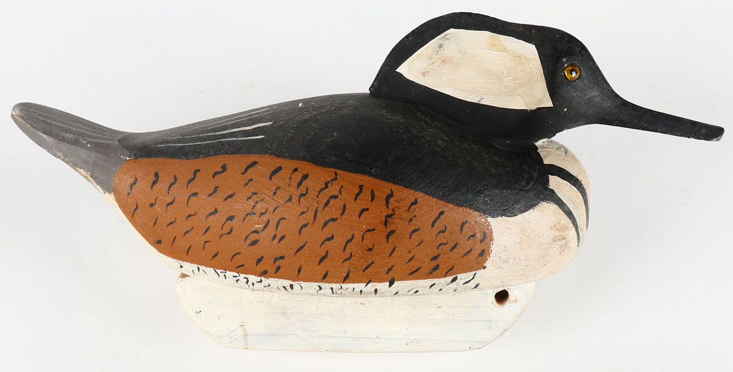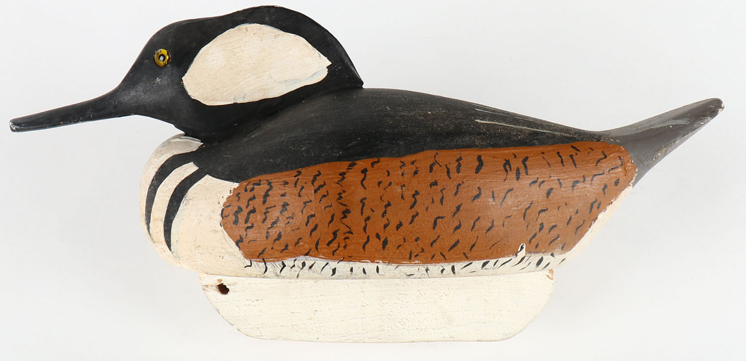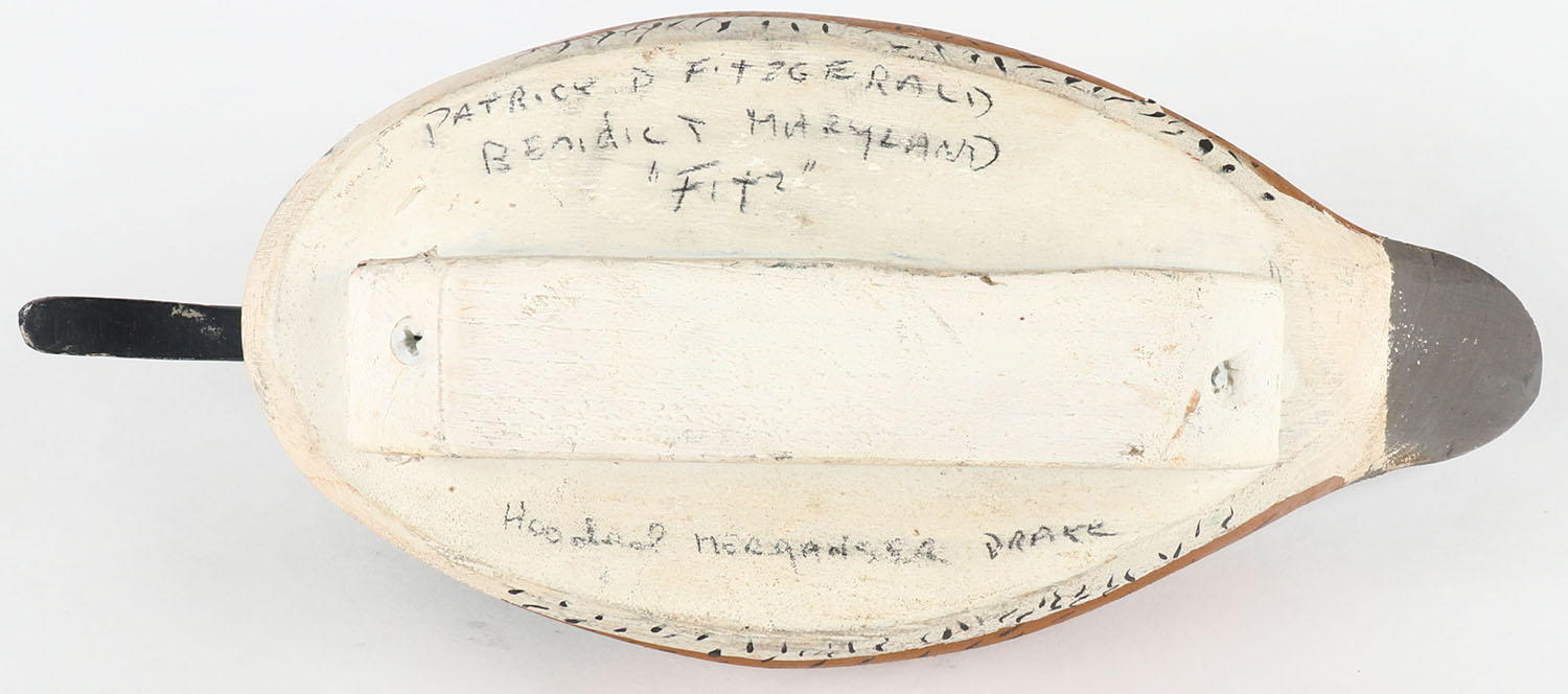 Hooded Merganser Drake by Patrick D Fitzgerald, Benedict, MD, ''FITZ'', GE, hollow wood, original paint, structurally excellent, signed on bottom, 12 1/2''. Grade: Excellent - Value: 40 to 80