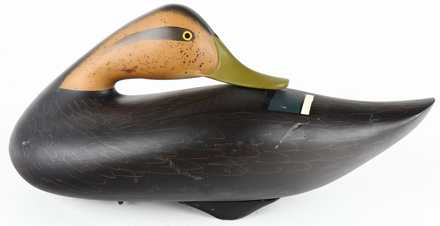 Preening Black Duck by Patrick ''Pat'' Vincent, Churchville, MD, painted eyes, solid wood, original paint, structurally excellent, signed on bottom, 14'' OAL. Grade: Excellent ++ - Value: 40 to 80
