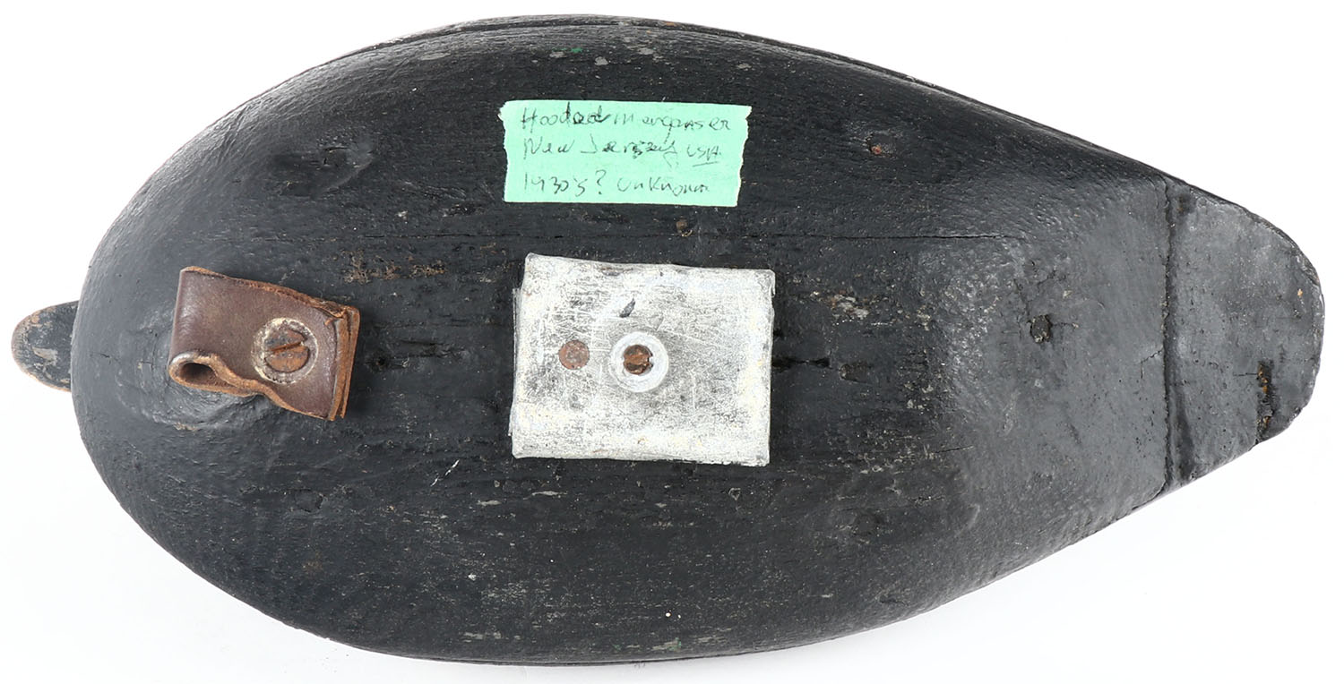 Hooded Merganser by unknown maker, TE, solid wood, very old working repaint, structurally excellent, has natrual hair on back of head, 12'' OAL. Grade: Very Good + - Value: 30 to 60
