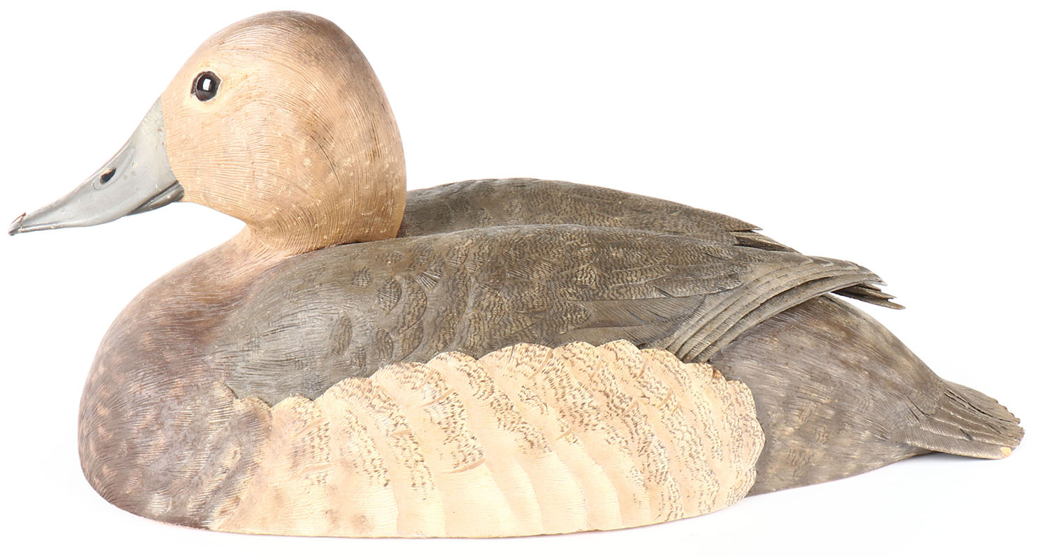 Canvasback Hen by Jack Szolis, glass eyes, solid wood, original paint, structurally excellent, nice wing reflief & feather detail, chip to front bill, signed on bottom, 13'' OAL. Grade: Very Good ++ - Value: 30 to 80
