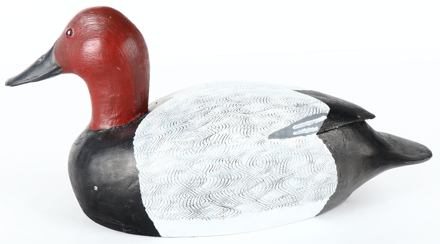 Canvasback Drake by Maynard Caine, Ontario, Canada, glass eyes, hollow wood with bottom board, original comb paint, structurally excellent, signed on bottom. Grade: Excellent + - Value: 30 to 60