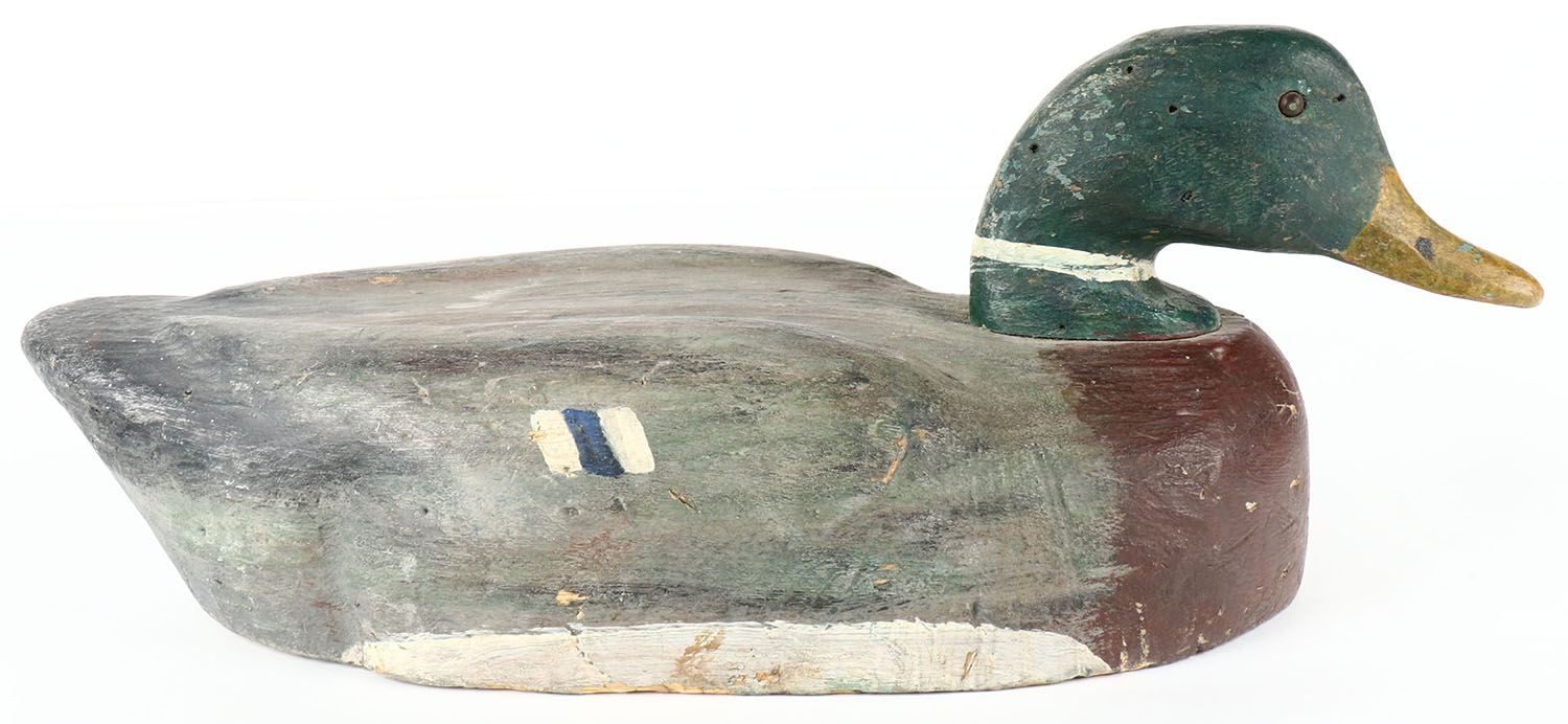 Mallare Drake by unknown maker, TE, balsa wood, original paint, structurally excellent, bill has hair line crack, 19'' OAL. Grade: Very Good - Value: 20 to 60