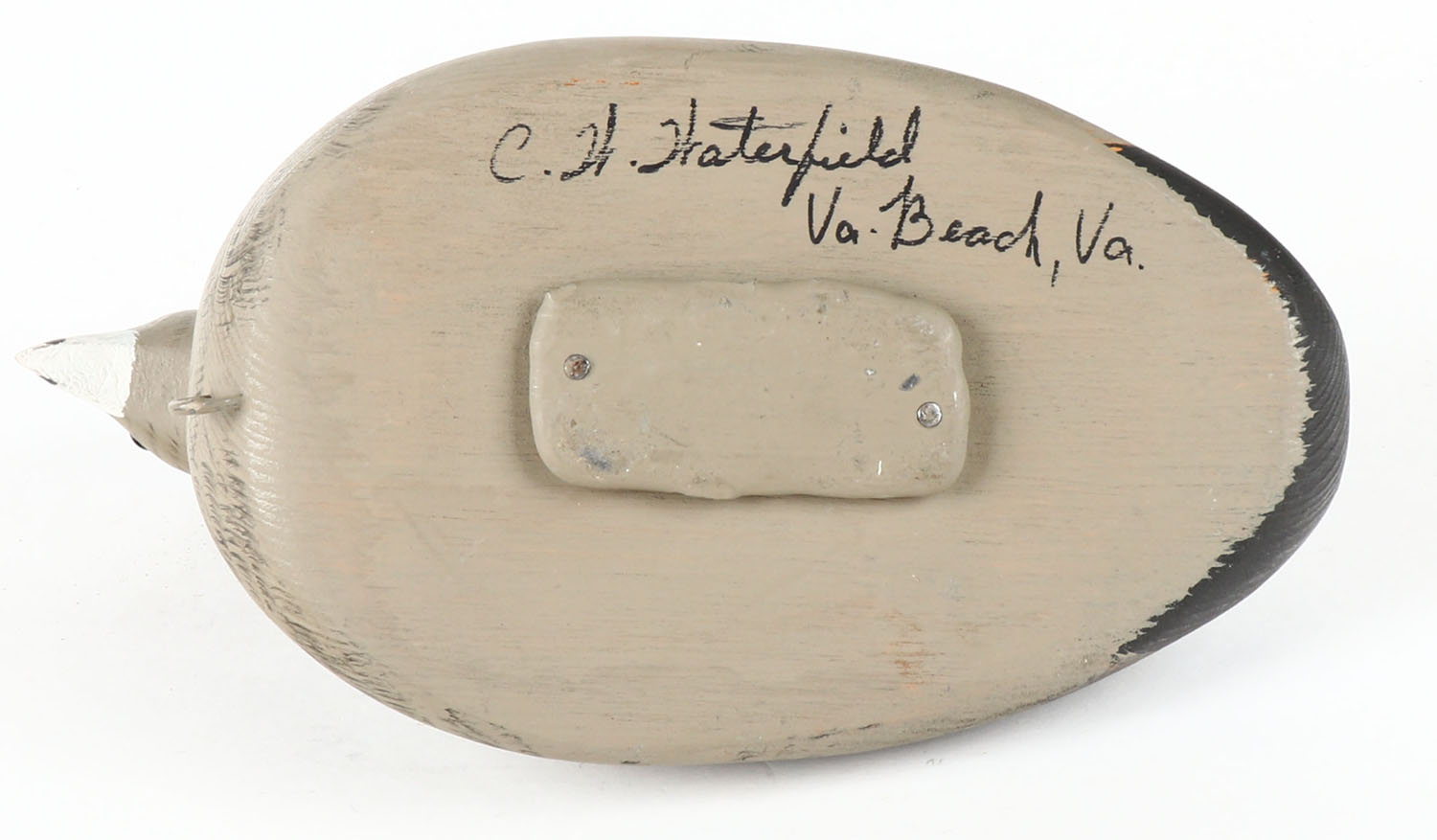 Coot by C.W. Waterfield, VA. Beach, VA, GE, solid wood, wonderful original paint iwth feather details, signed on bottom, 9''. Grade: MINT - Value: 30 to 60