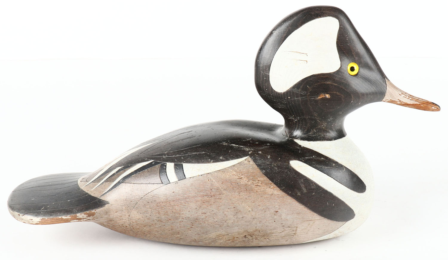 Hooded Merganser by John Jeffery Barts, GE, solid wood, original paint, bill has repaired crack at tip. Grade: Very Good ++ - Value: 20 to 60