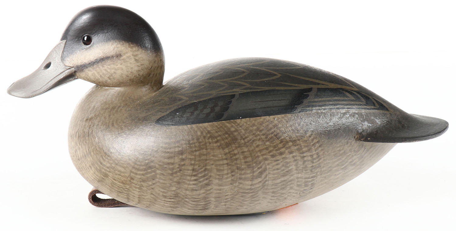 Ruddyduck Hen by Frederick C. Brown, RT Pleasant N.J. Ocean County, glass eyes, hollow wood, excellent original paint, structurally excellent, copper tag by FREDERICK C. BROWN on bottom, Paired Drake is in the prevoius lot. Grade: MINT - Value: 100 to 200