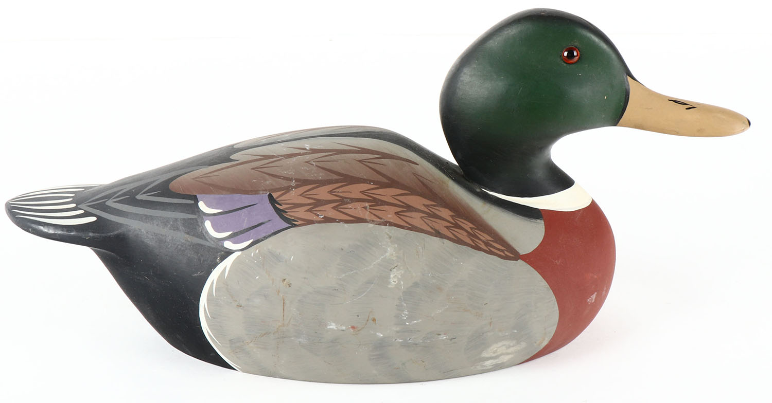Woodduck Drake by Raymond Hornick, Stoney Point Decoys, Oak Hall, VI, glass eyes, solid wood, original paint, structurally excellent, stamped & signed on bottom. Grade: Excellent + - Value: 20 to 40