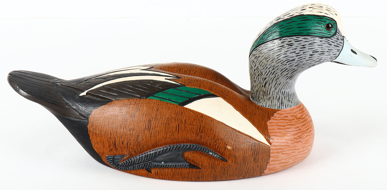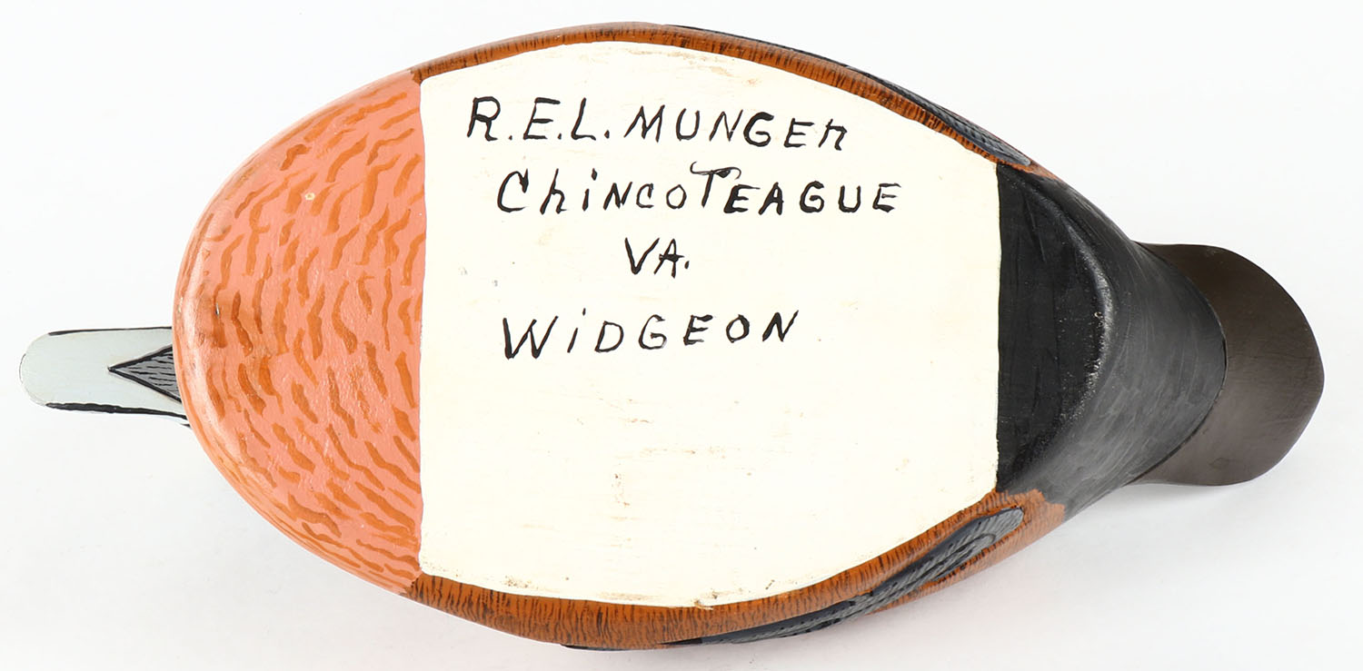 Widgeon Drake by REL Munger, Chincoteague, VA, GE, solid wood, nice original paint, 13'' OAL. Grade: Excellent ++ - Value: 20 to 60