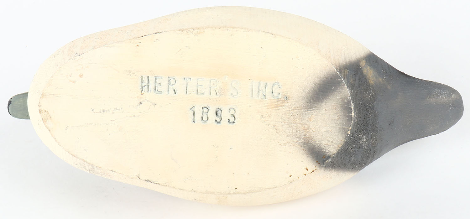 Bufflehead Drake by Herters Decoy Co., Waseca, MN, 1893 series, glass eyes, solid wood, original paint, structurally excellent, marked on bottom. Grade: Excellent - Value: 50 to 100