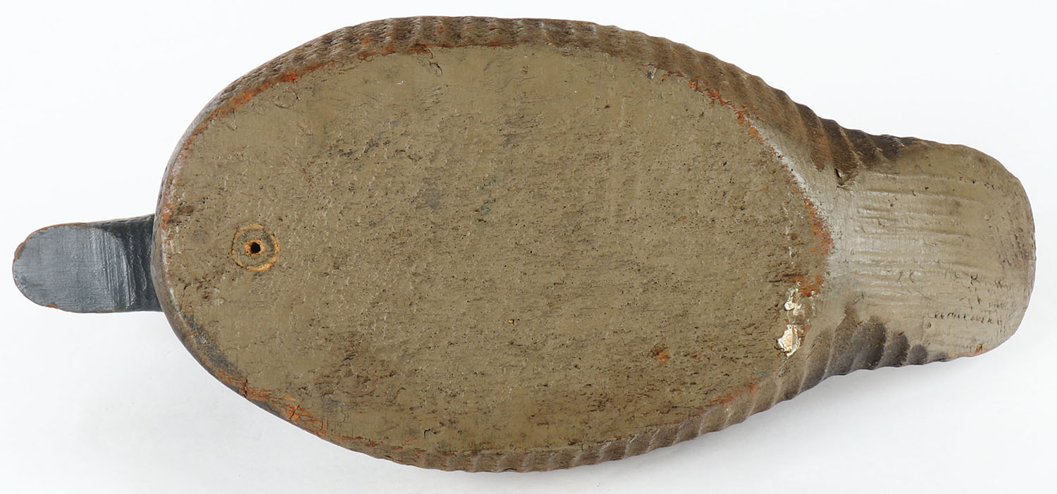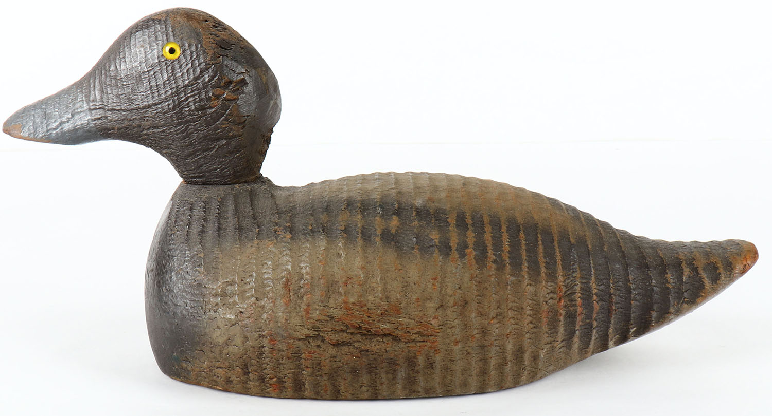 Bluebill Drake by ?? Factory lathed wood decoy, GE, hollwo wood, original paint, 14'' OAL. Grade: Excellent - Value: 10 to 30