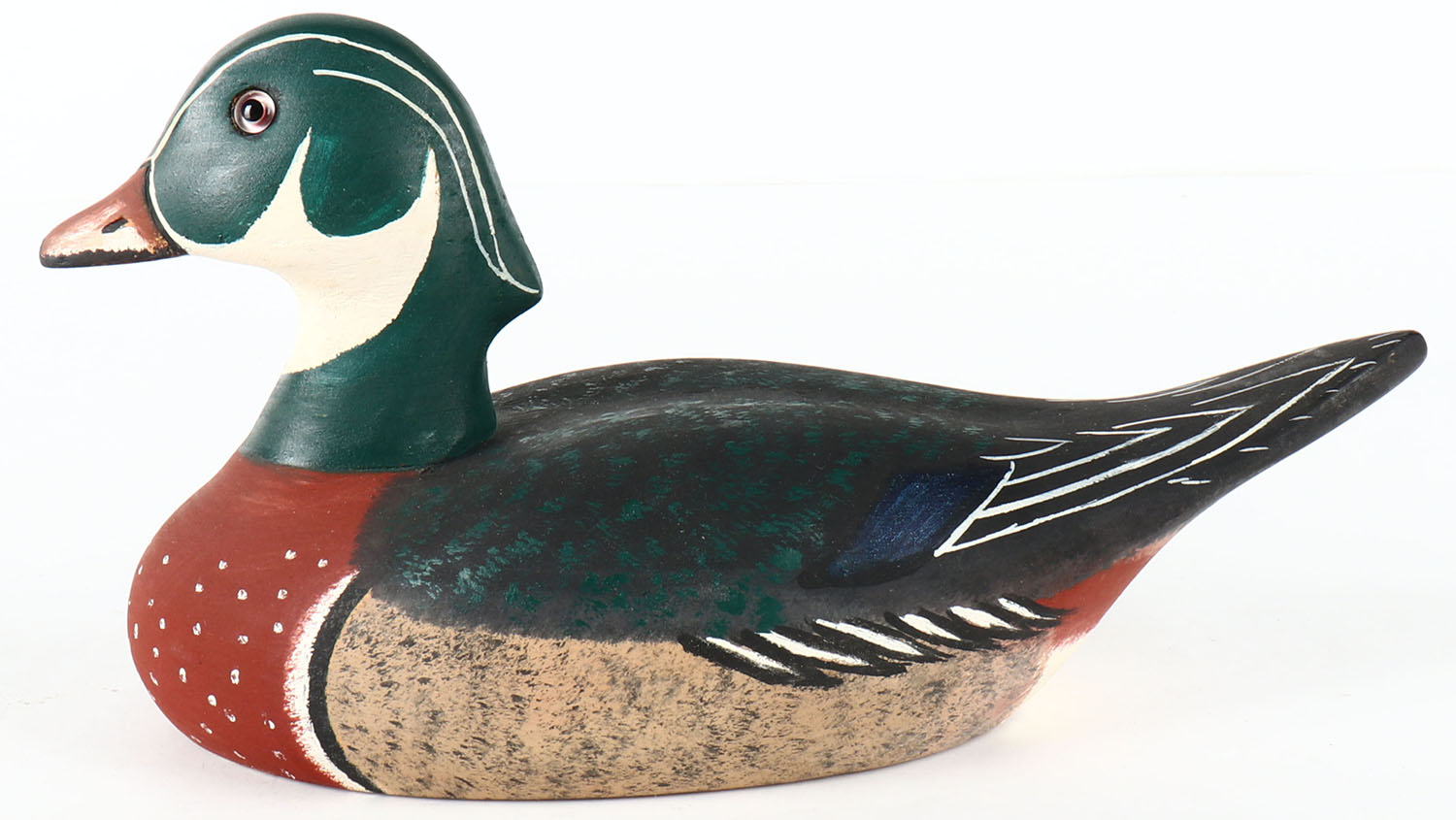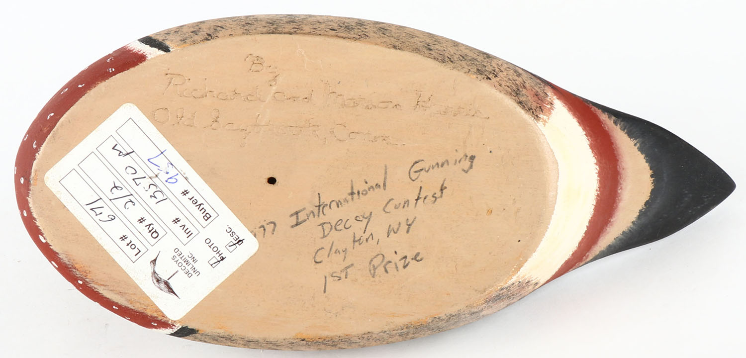 Woodduck Drake by Richard and Marian Harris, Old Saybrook, Conn, ''1977 International Gunning Decoy Contest Clayton NY 1st Prize'', GE, hollow wood, mint original paint, paired hen is lot 6262, 11'' OAL. Grade: MINT - Value: 100 to 200