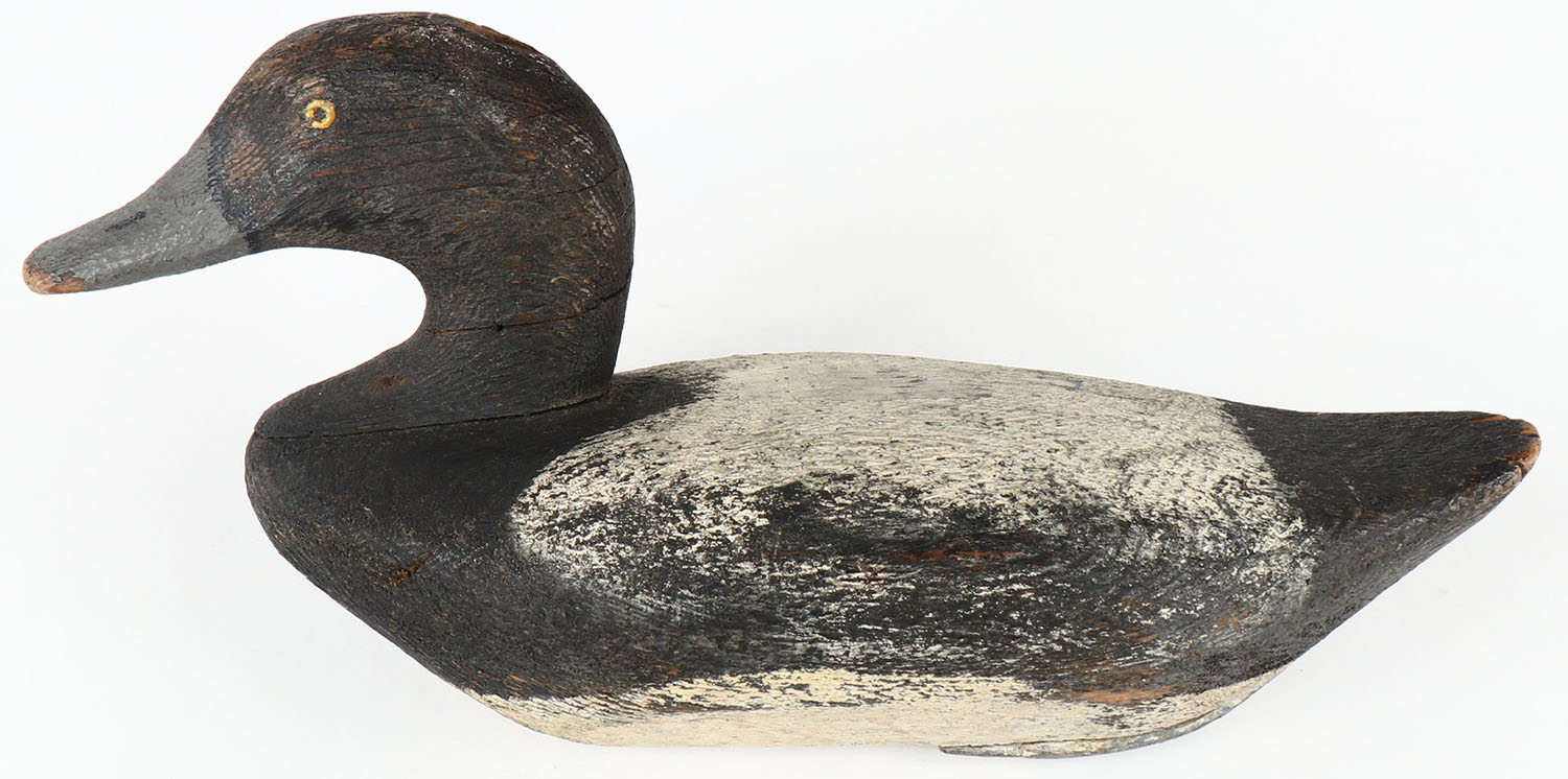 Bluebill Drake by unknown maker, PE, solid wood, original paint, hiar line crake in neck, 13'' OAL. Grade: Very Good - Value: 10 to 60