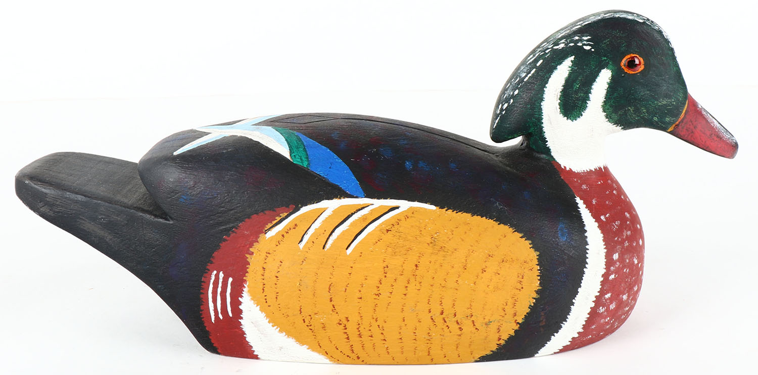 Woodduck Drake by Doug Hevener, GE, solid wood, original paint, 13'', OAL. Grade: Excellent - Value: 10 to 50