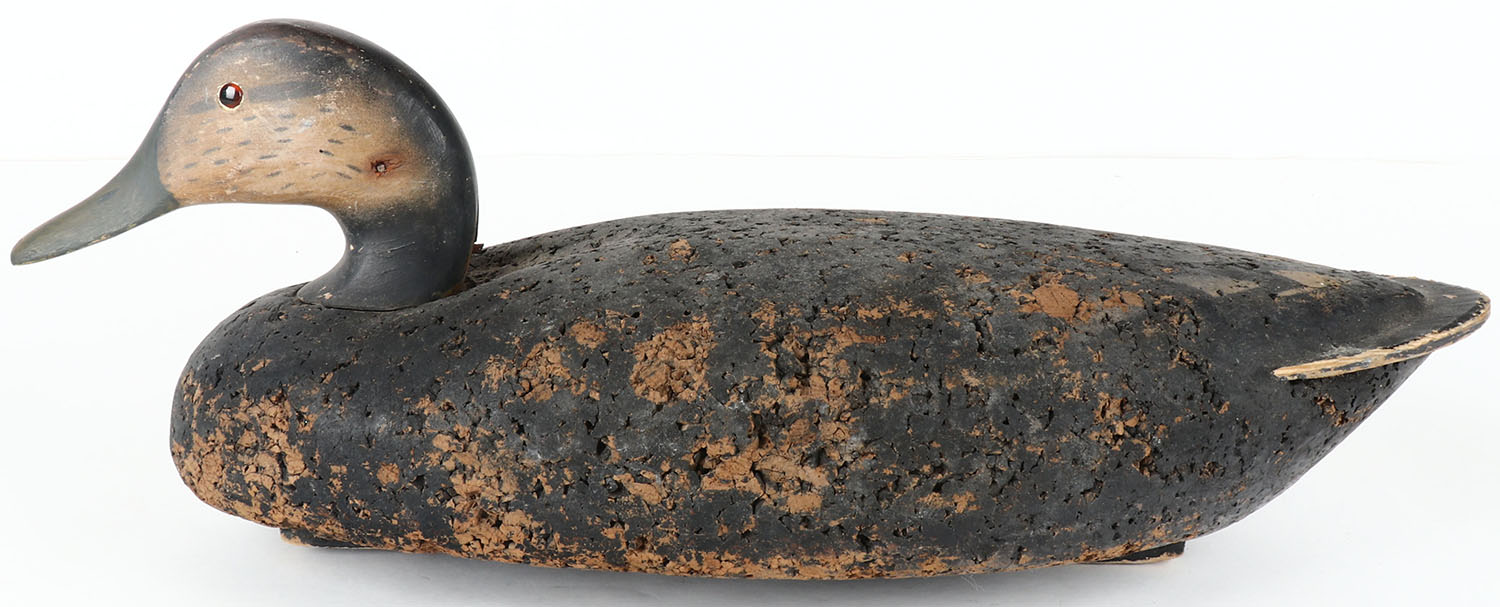 Black Duck by LL Bean, unmarked on keel, glass eyes, solid cork body, wood head, original paint, structurally excellent, 20'' OAL. Grade: Very Good ++ - Value: 20 to 40