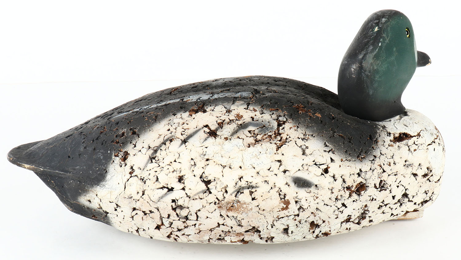 Goldeneye Drake by L.L. Bean, umarked keel, glass eyes, solid cork body, wood head, original paint, structurally excellent, 16'' OAL. Grade: Excellent - Value: 10 to 50