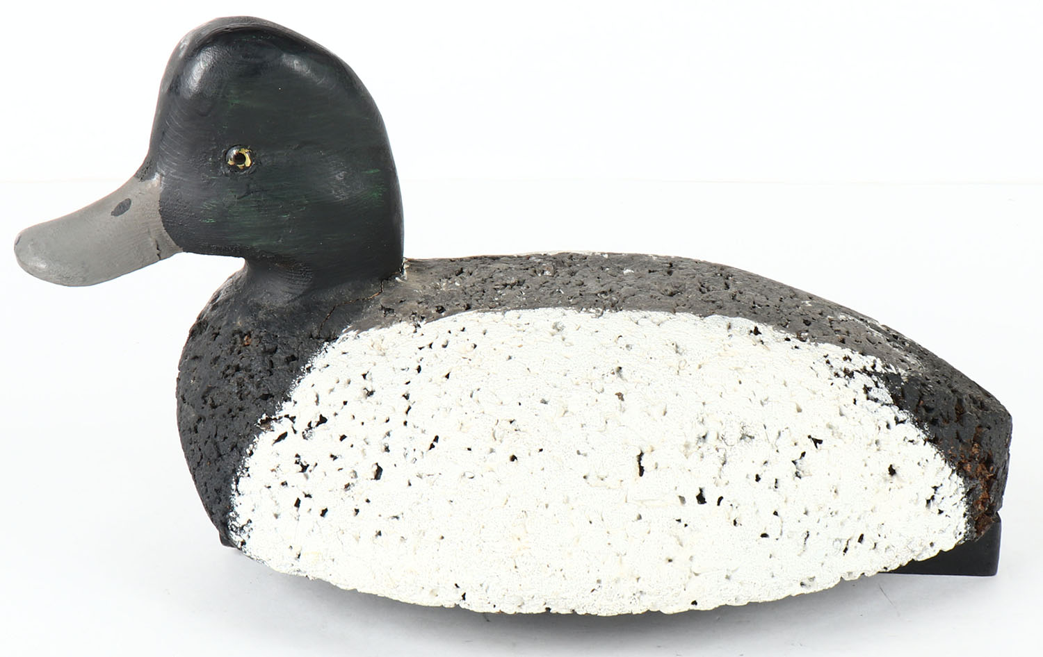 Bluebill Drake by Con G. (hard to read), glass eyes, solid cork body, wood head, original paint, structurally excellent, 13'' OAL. Grade: Excellent + - Value: 20 to 50