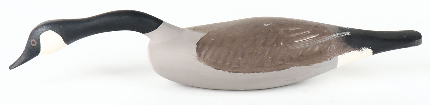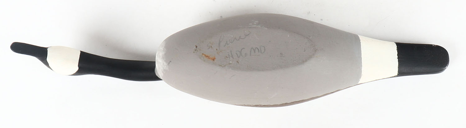 Miniature Swimming Canada Goose by S. Pierce, Havre de Grace, MD, PE, solid wood, mint original paint, signed on bottom, 11 1/2'' OAL. Grade: Excellent ++ - Value: 30 to 60