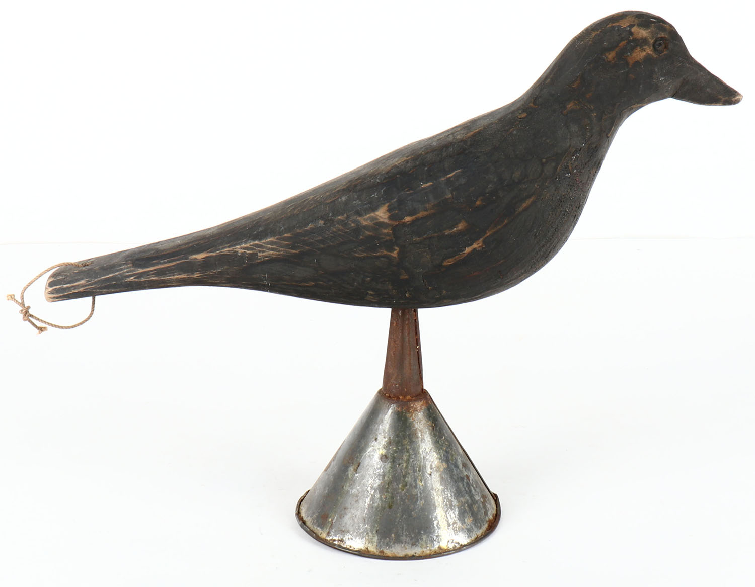 Crow decoy by unknown maker on metaql oil spout stand, no eyes, solid wood, original paint, 14 1/2'' OAL. Grade: Excellent - Value: 10 to 40