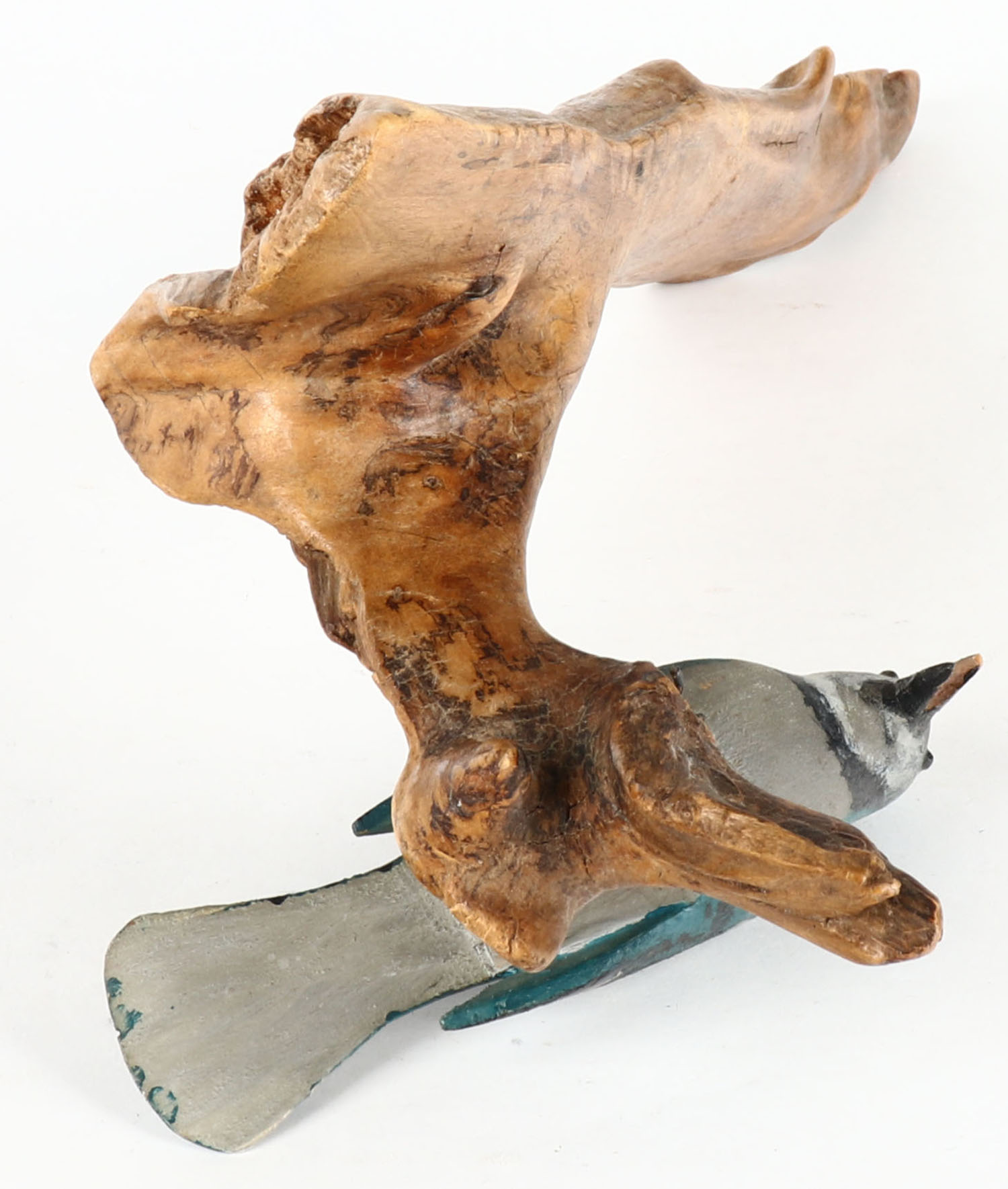 Miniature Bluejay on wood wall mount, unknown maker, PE, solid wood, mint original paint, bird is 5 1/2'' tall. Grade: Excellent ++ - Value: 10 to 50
