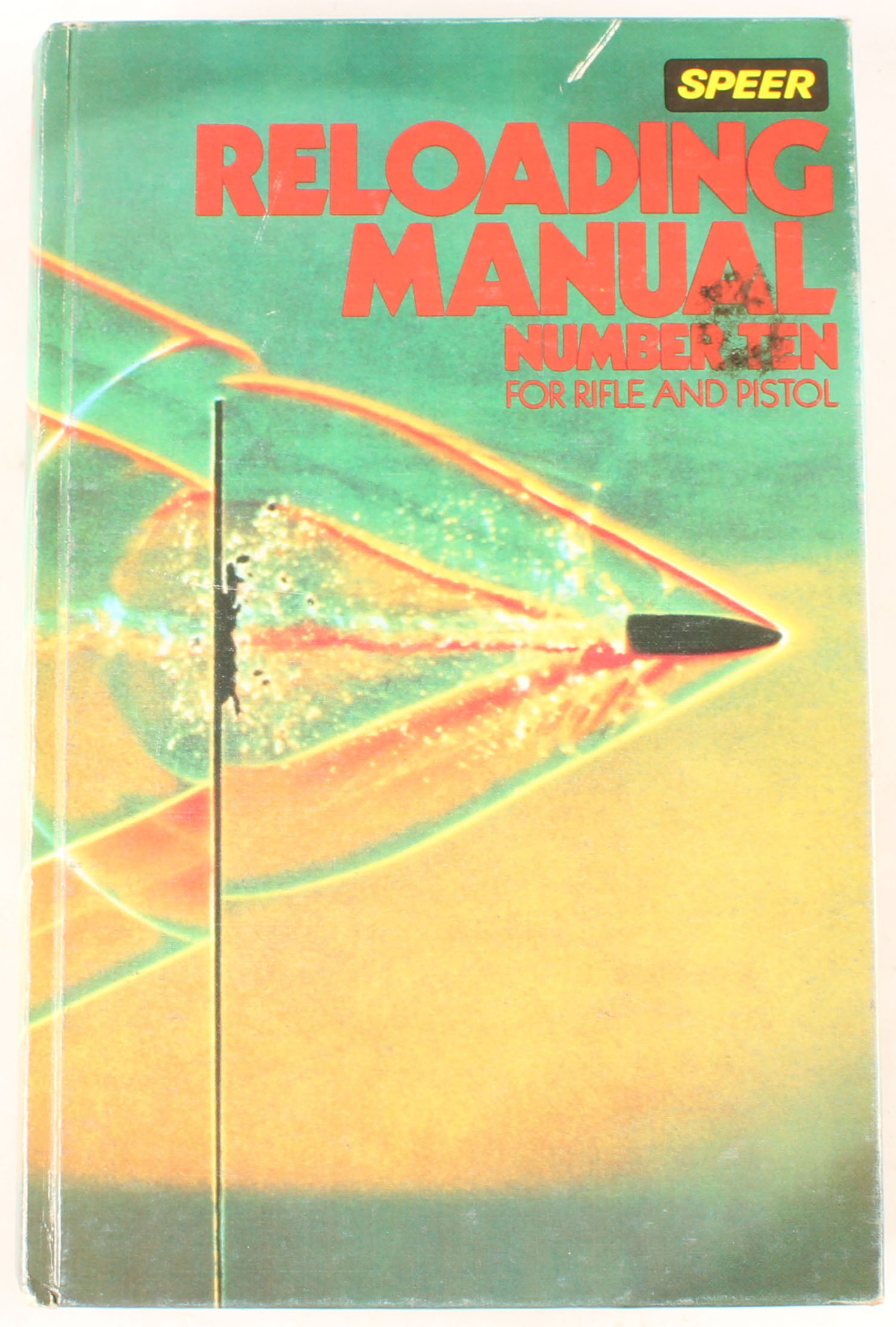 Speer Reloading Manual Number Ten for Rifle and Pistol, 5 1/2'' 8 1/2''. 560 pages, pages clean, binding tight, hardcover very good. Value: $30 Grade: Very Good ++ - Value: 2 to 30