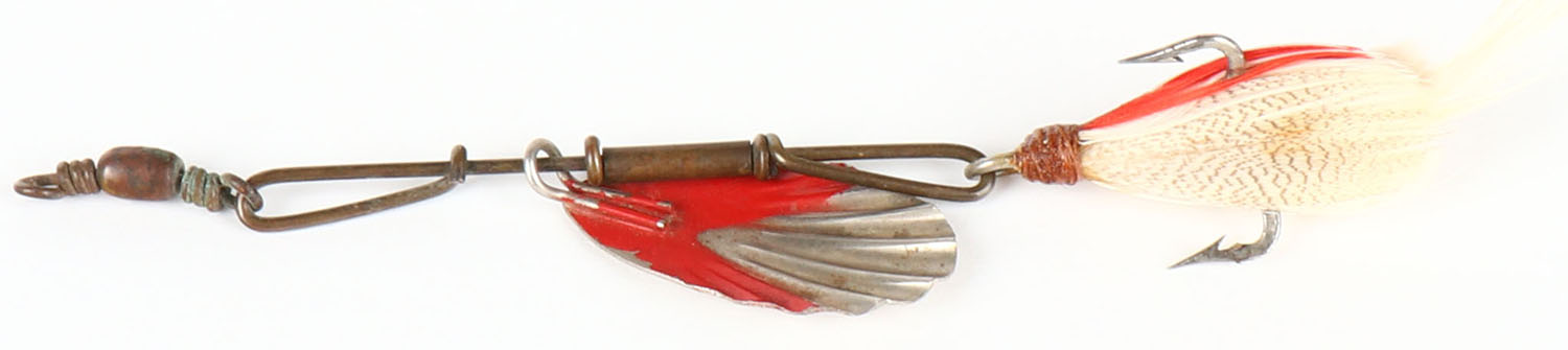 Winchester Fluted Trolling spoon No 9642, Nickel & red blade with feather teaser, 1 hook. Grade: Excellent - Value: 10 to 50