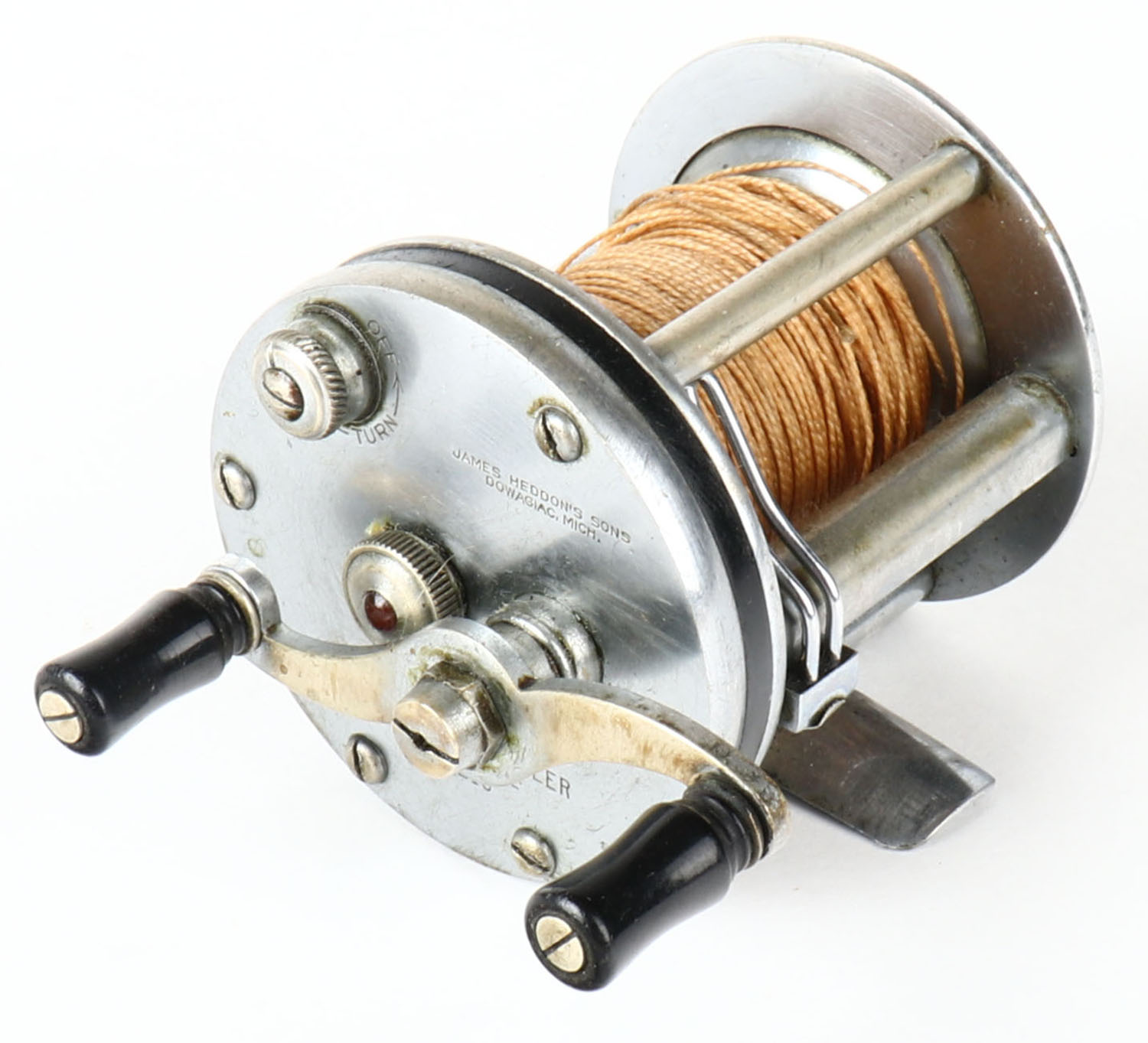 James Heddon & Sons, White house Angler, No 215, Bait Casting level wind reel, dual handle, strong click, works well. Grade: Excellent - Value: 20 to 50