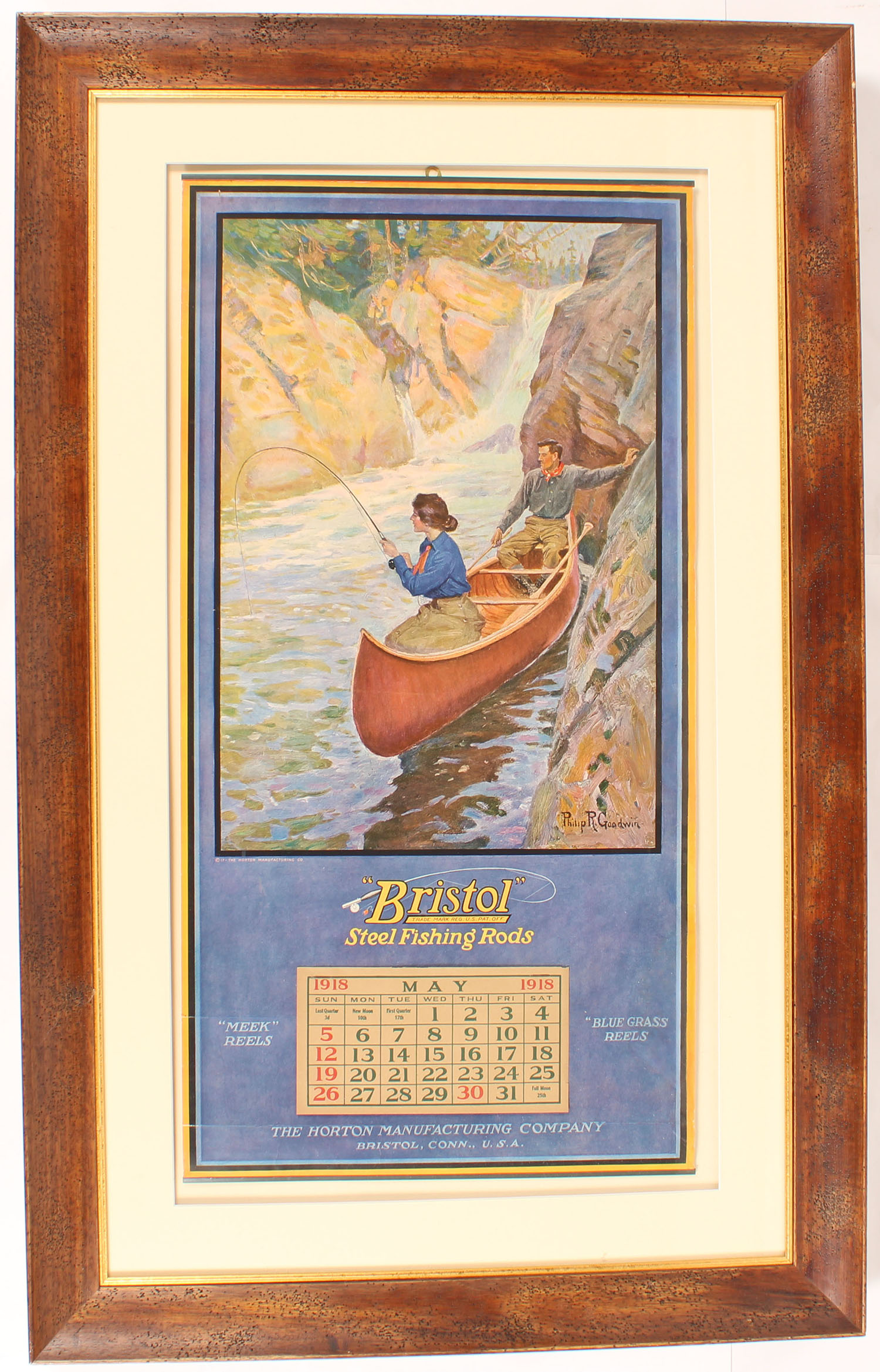RARE 1918 BRISTOL Calendar, THE ''BRISTOL'' STEEL ROD, ''MEEK REELS'', ''BLUE GRASS REELS'', pictures wonderful full colored image of woman landing a trout in a birch canoe, ''Horton MFG Co.'', has metal bands top or bottom, brass hanger, May page, 16'' x 31'', has seen professional restored on right side edges only, framed. Grade: Excellent - Value: 2000 to 4000