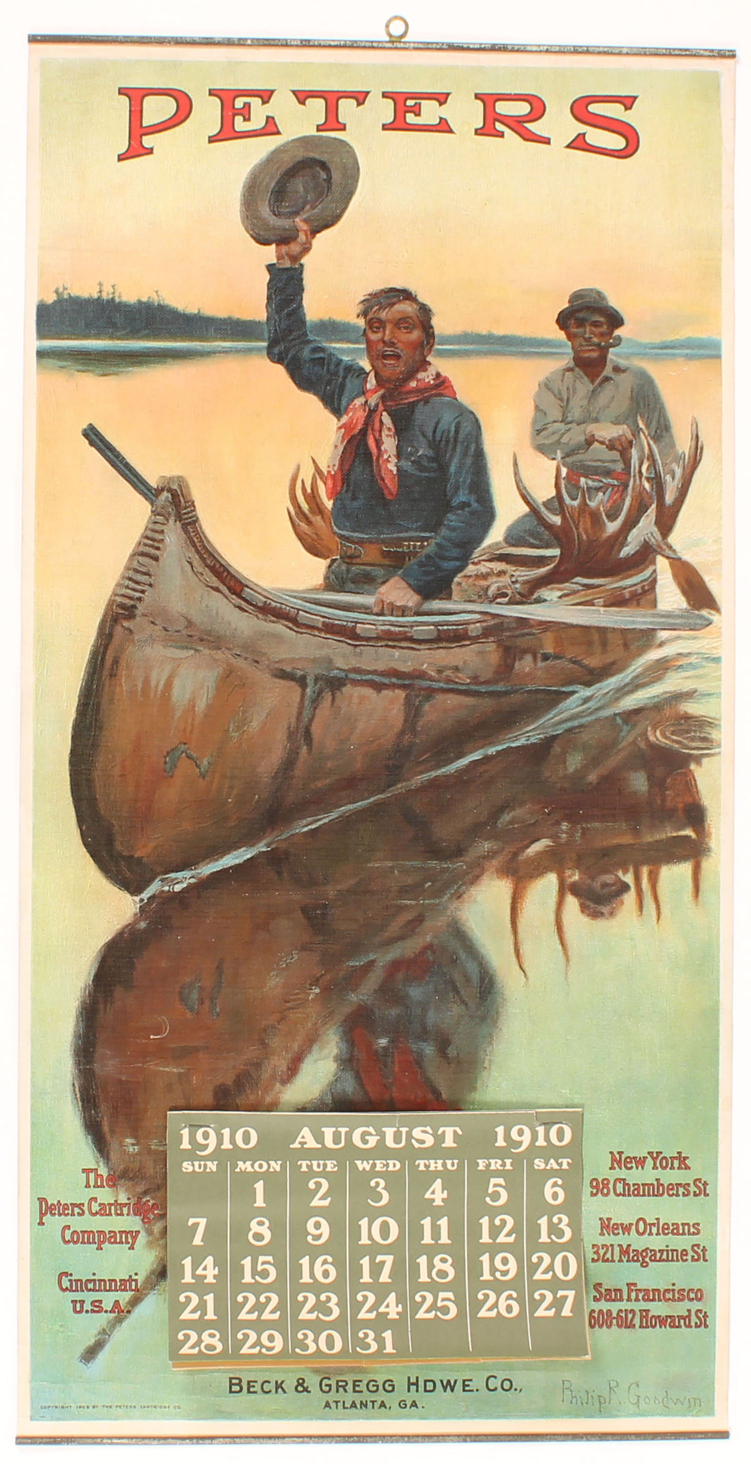 VERY RARE 1910 Peters Cart Co. Calendar, Artist Philip R. Goodwin, has near perfect image of two moose hunters in birch canoe, large bull moose antlers in middle, has brass bands & brass hanger, has been professional touched up along both bands otherwise all original, Aug - Dec pages, wonderful colors and no roll wrinkles, very few of these ever come to auction, Best one we have seen! Grade: Excellent + - Value: 3000 to 6000
