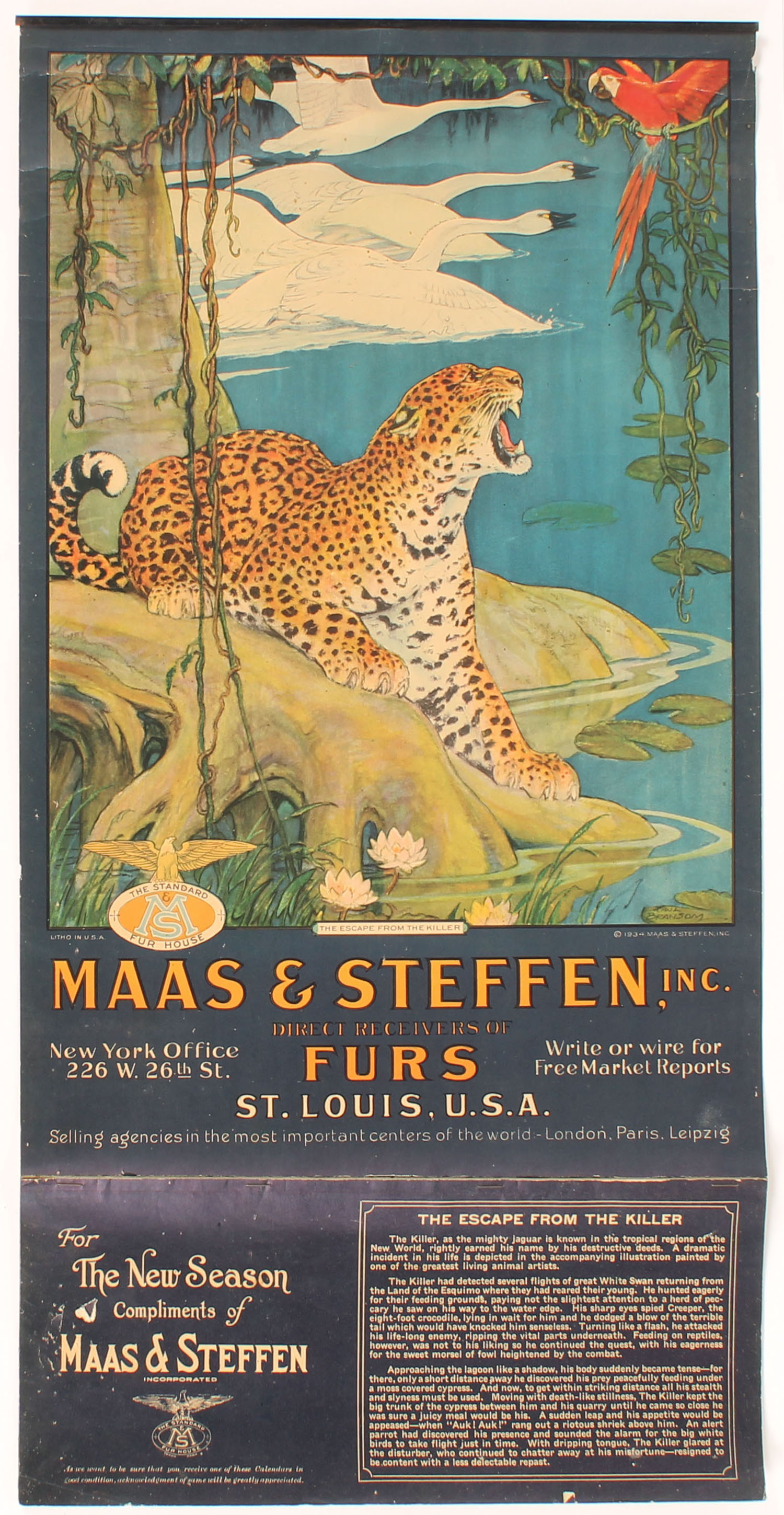 Maas & Steffen 1935 Calendar, ''THE ESCAPE FROM THE KILLER'', pictures Leopard about to attack a Parret in a tree, 13 1/2'' x 27'', has original band with hanger, shows very micro wear to edges otherwise mint, Full Pad of Pages, has great color with beautiful image. Grade: Excellent ++ - Value: 600 to 1200