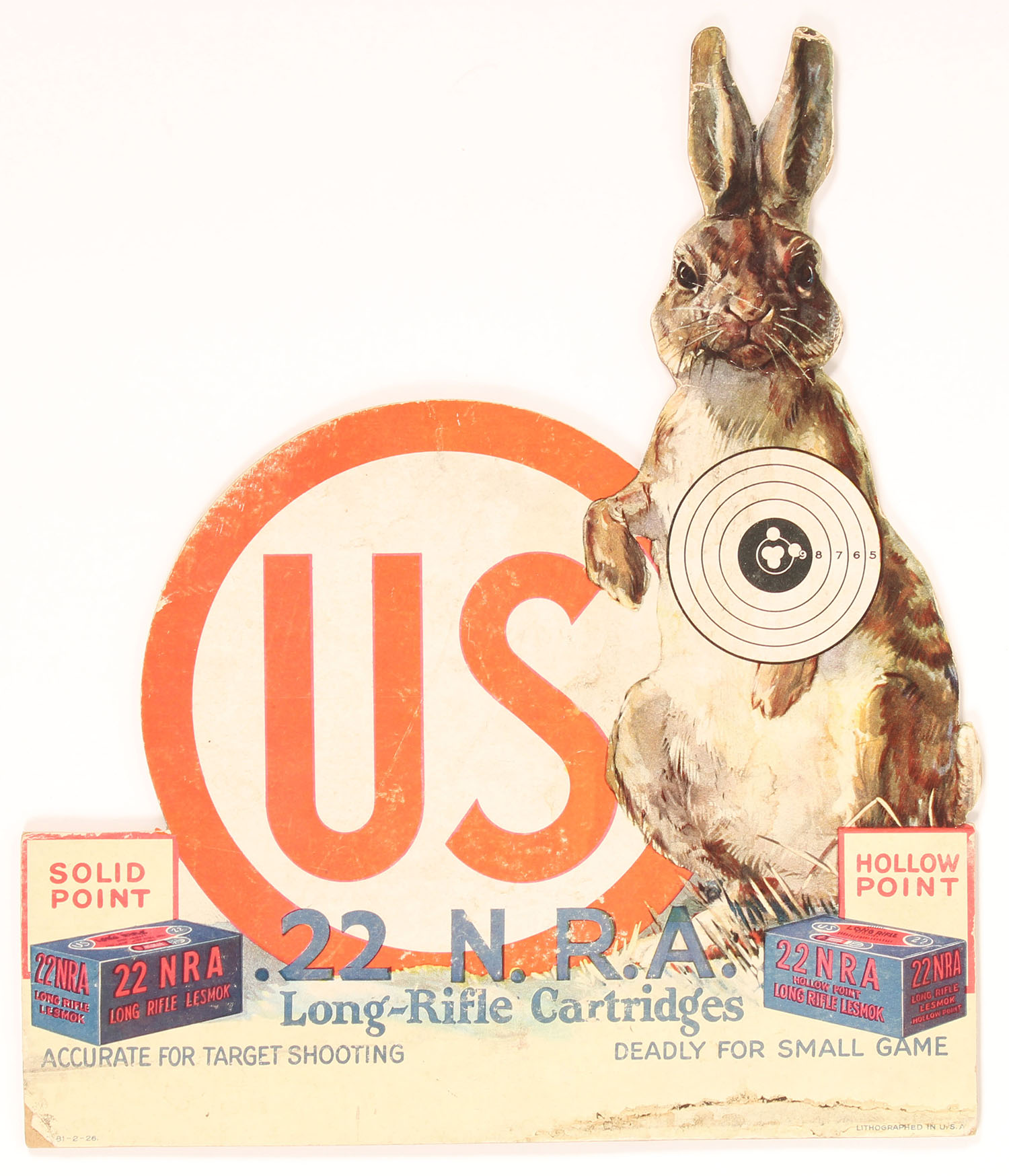 VERY RARE US Cart. Diecut, pictures .22 NRA Solid Point & Hollow Point boxes with Rabbit leaning up against the US logo & a target in his chest, ''Accurate for target shooting & Deadly for small game'', has easel back shows a tear to paper at bottom otherwise very nice, 12 5/8'' x 14 3/4'', only one we have seen & not pictures in any book. Grade: Very Good ++ - Value: 300 to 2000