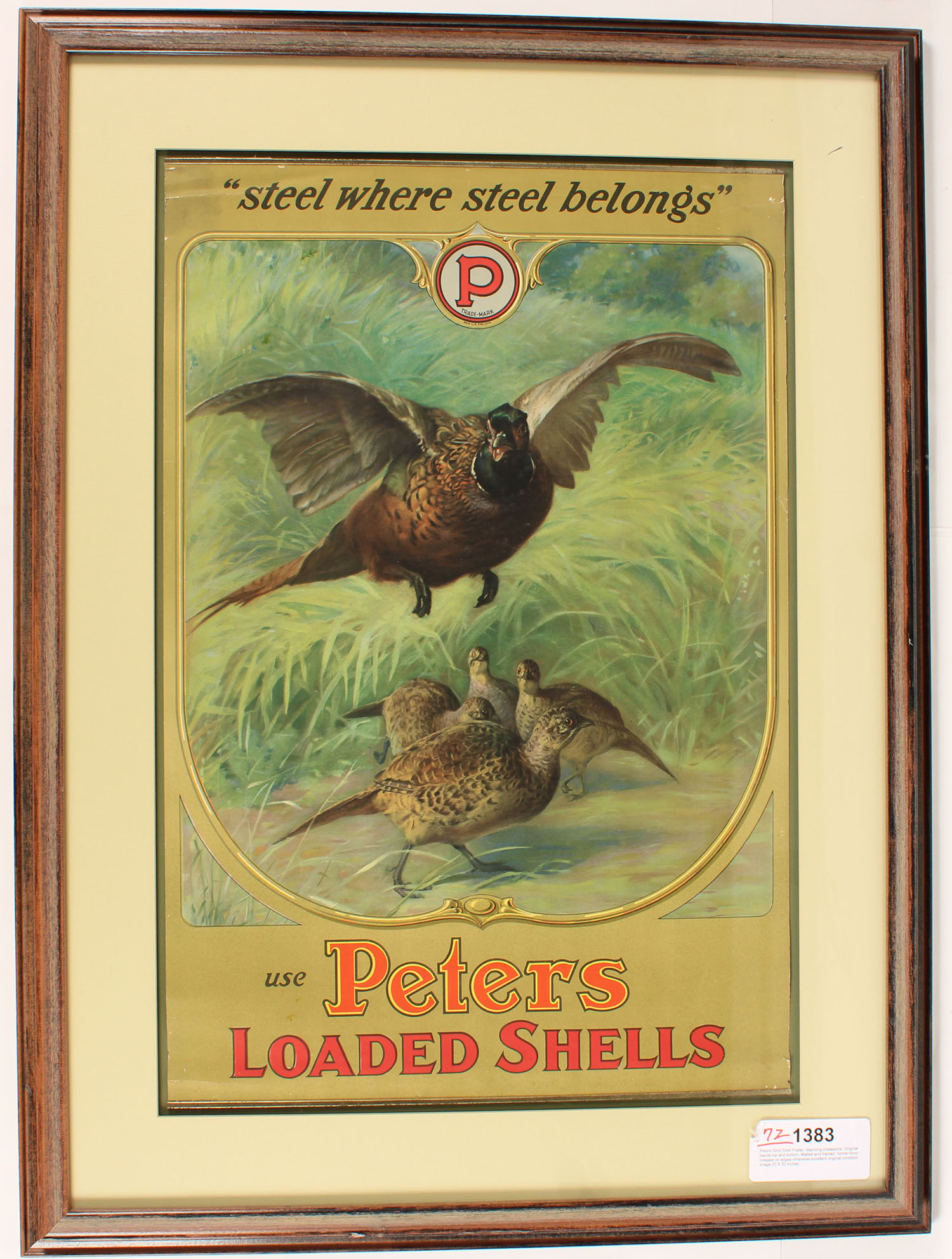 RARE Peters ''STEEL WHERE STEEL BELONGS'' ''USE PETERS LOADED SHELLS'', poster, pictures pheasants in grass, shows edge wear & age soiling, has both brass bands & hanger, 20 1/4'' x 30 1/4'', has fantastic colors very little edge wear, one of the best we have seen, framed. Grade: Excellent + - Value: 1000 to 5000