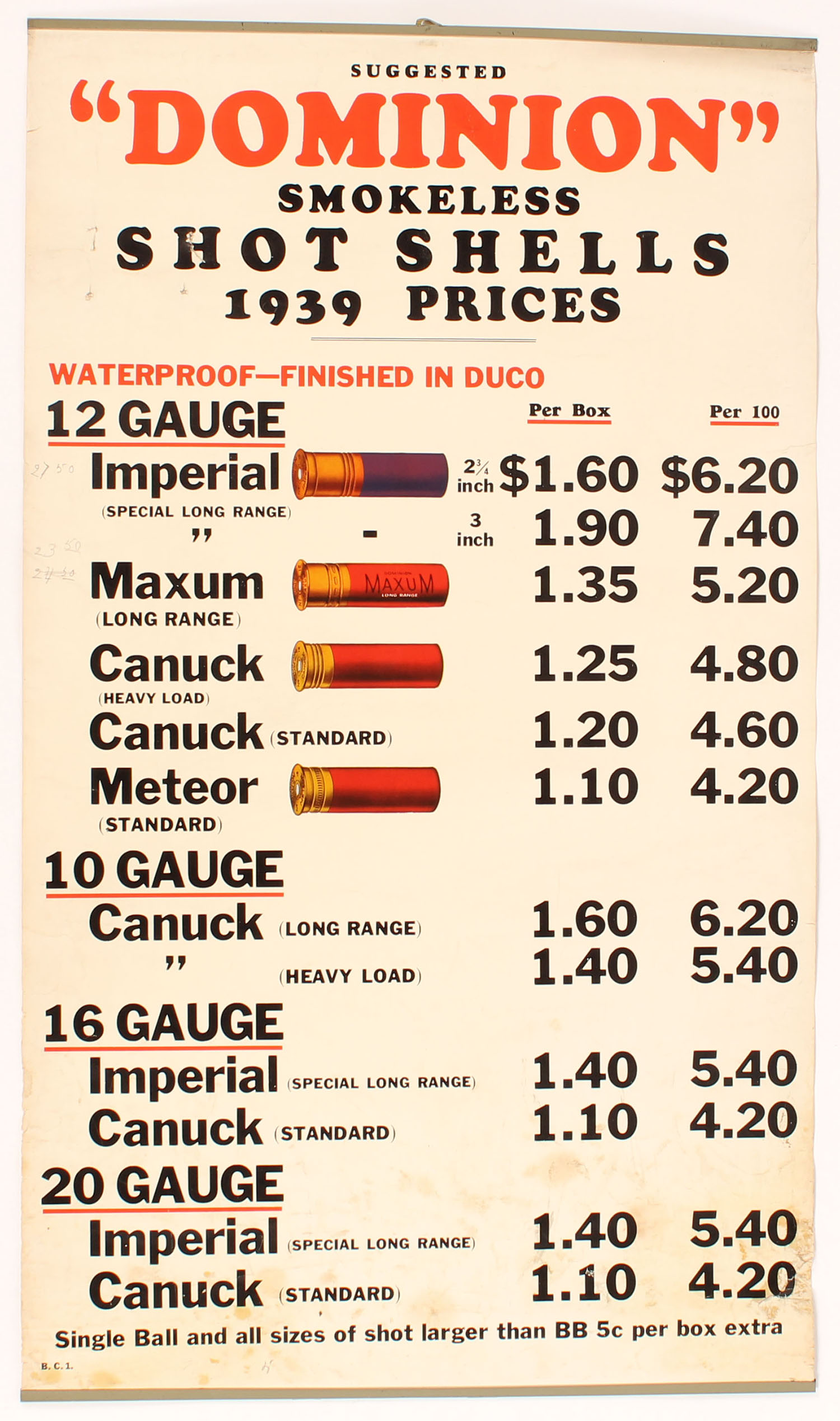 RARE DOMINION poster, pictures Smokeless Shot Shells in color, with the 1939 prices. Has bands top & bottom, with brass hanger, 14'' x 24'', Has great color, with some light stains to bottom. Only one we have seen! Grade: Very Good ++ - Value: 250 to 500