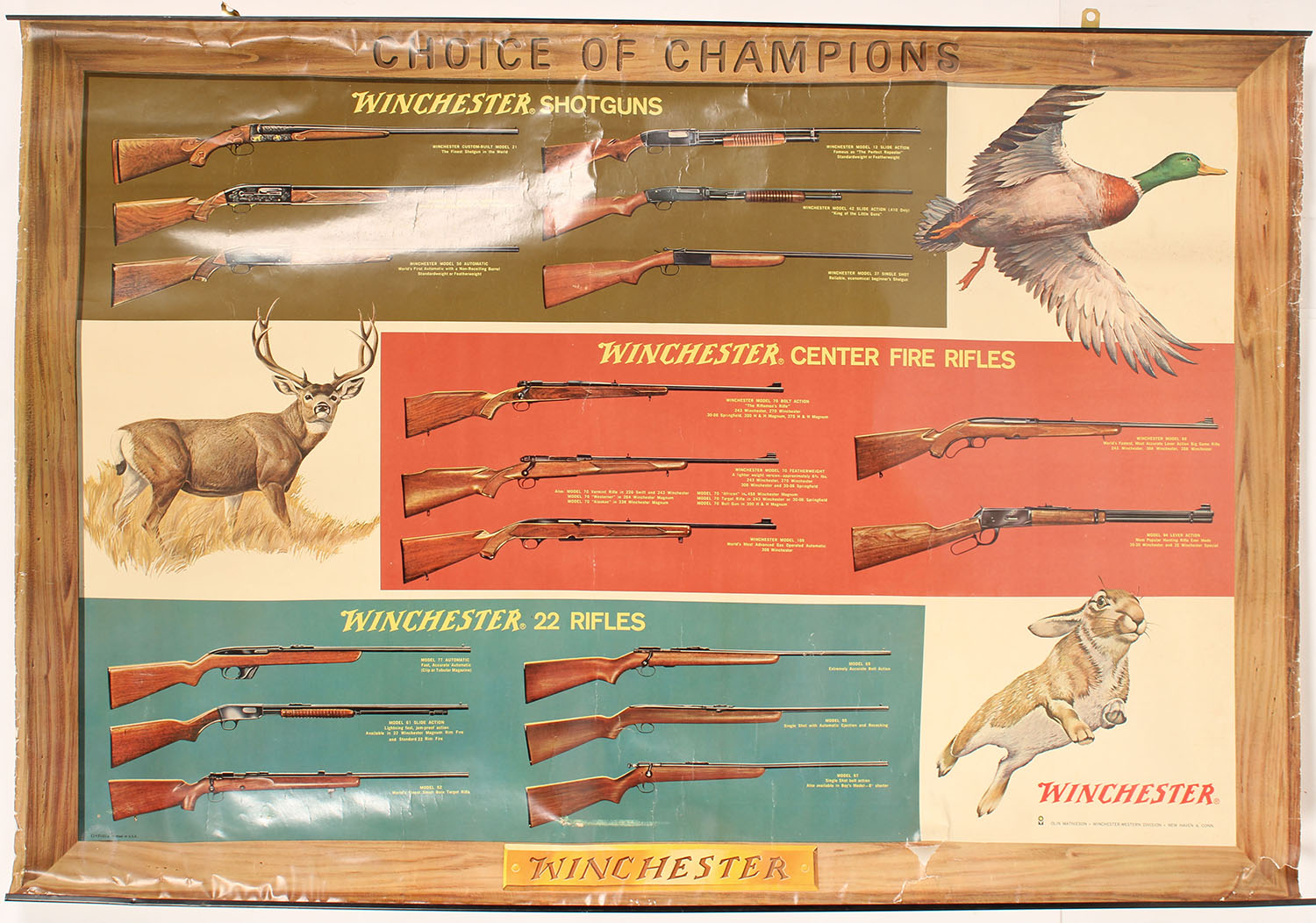 Winchester Choice of Champions poster, pictures many guns, ammo & animals, bands top & bottom with two brass hangers, 35 1/2'' x 25'', shows wrinkles & tears. Grade: Very Good - Value: 20 to 100