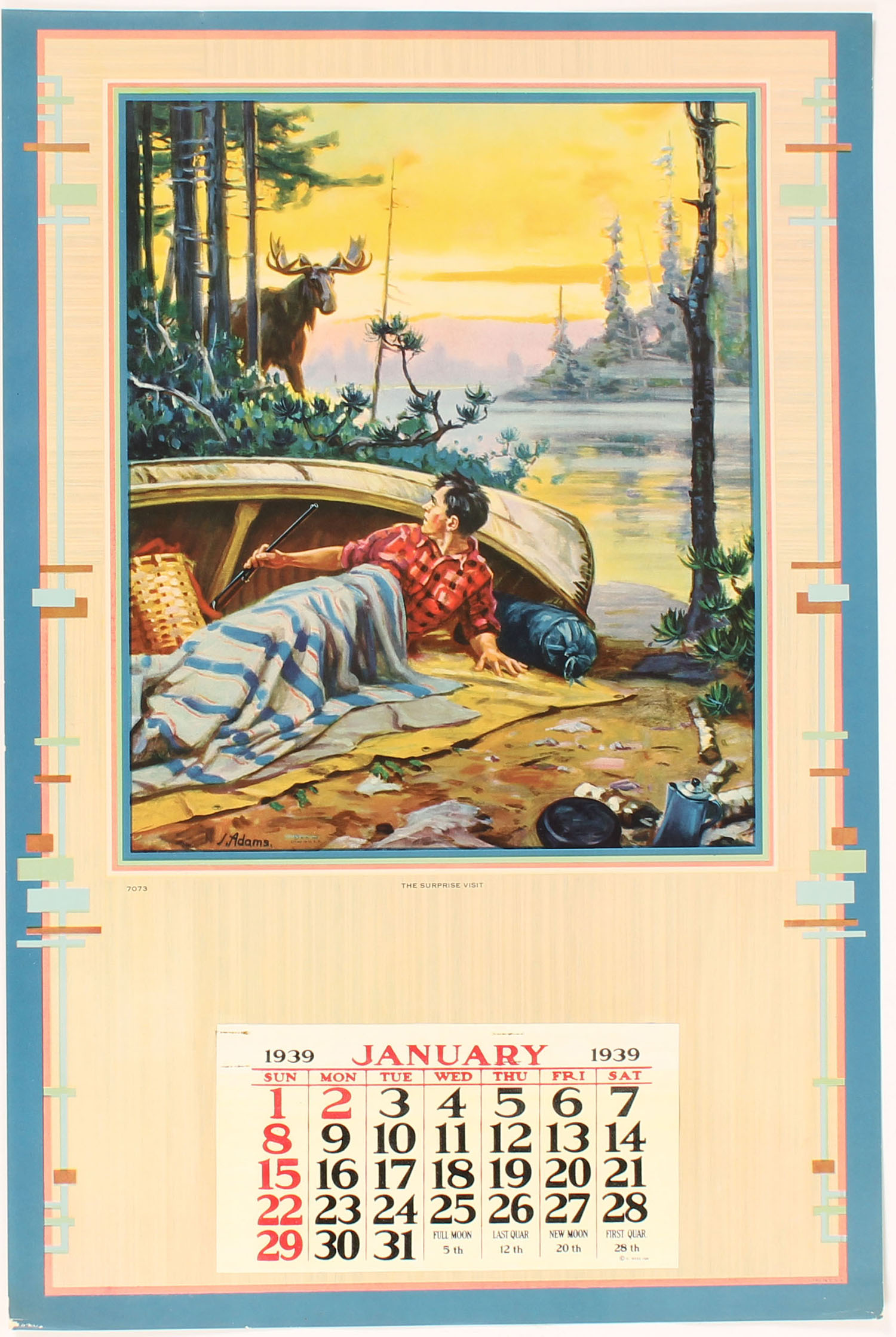 1939 Calendar by J. Adams, A SUPRISE VISIT, pictures a hunter waking up at camp sight with a bull moose in camp. Grade: Excellent ++ - Value: 10 to 50