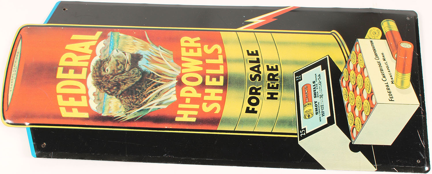 Federal HI-POWER SHELLS FOR SALE HERE, metal sign, pictures a large shot shell with retriever at top & 2pc shotshell box at bottom, very nice color with all most no wear, 11 1/2'' x 28''. Grade: Excellent - Value: 70 to 220