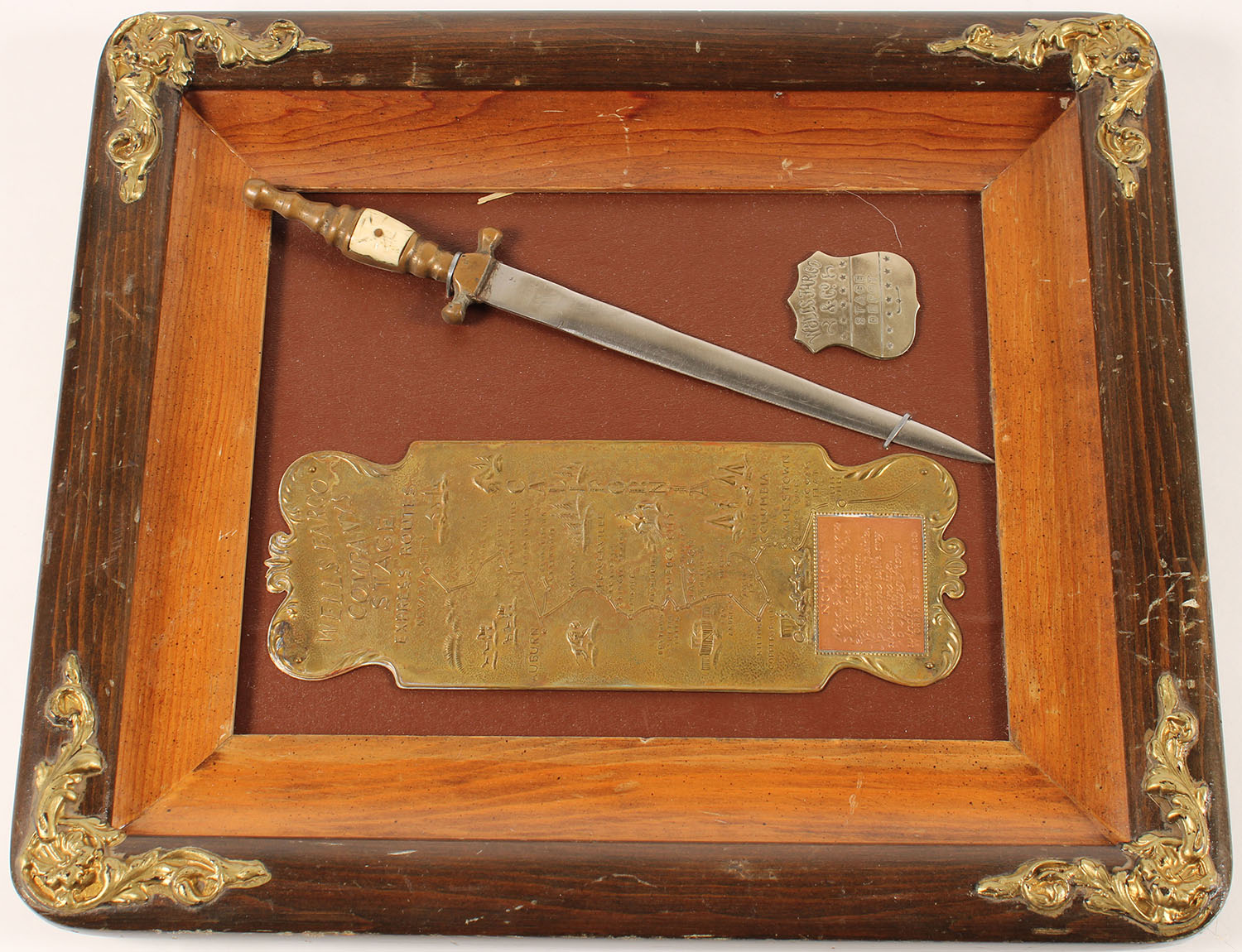 Wells Fargo & Co. Stage Express Routes, has brass plaque showing the route a knife & a badge, framed, 14'' x 16''. Grade: Excellent - Value: 20 to 200
