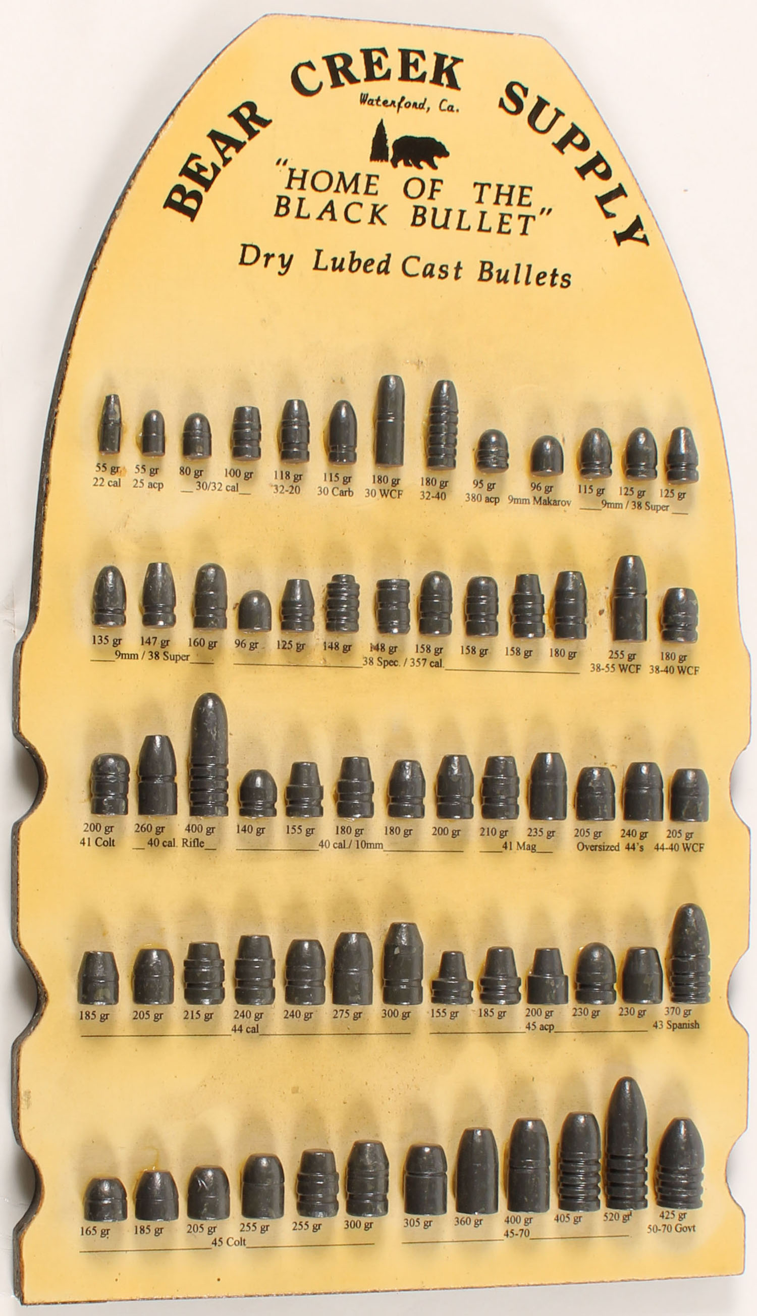 Bear Creek Supply bullet board, all bullets are intact, 8'' x 14''. Grade: Excellent ++ - Value: 50 to 250
