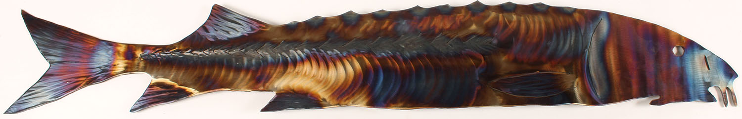Stergeon metal sign hand made of heavy metal, then heated to bring out some color, 48'' long, has two heavy duty hanging hooks. Grade: Excellent - Value: 30 to 300